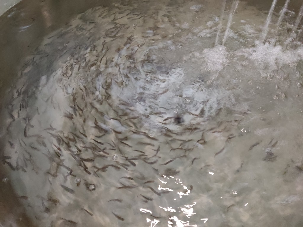 Ens ensenya tota la fàbrica, que està mig parada. Creiem entendre que l’època no és la bona, però la veritat és que cada vegada que li fem una pregunta tècnica, com les temporades de cria, temps a cada tipus d’estanc o quantitat de peixos que treballen, ens remet al seu cap, que ara no hi és.
