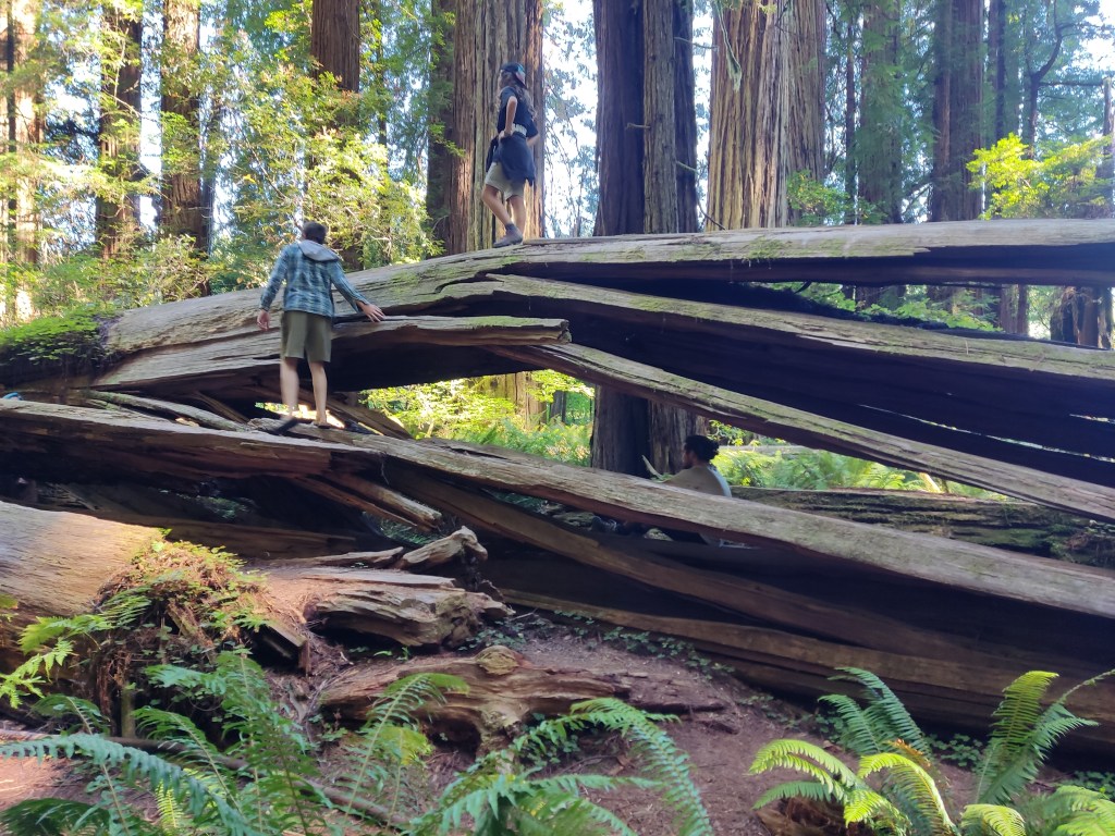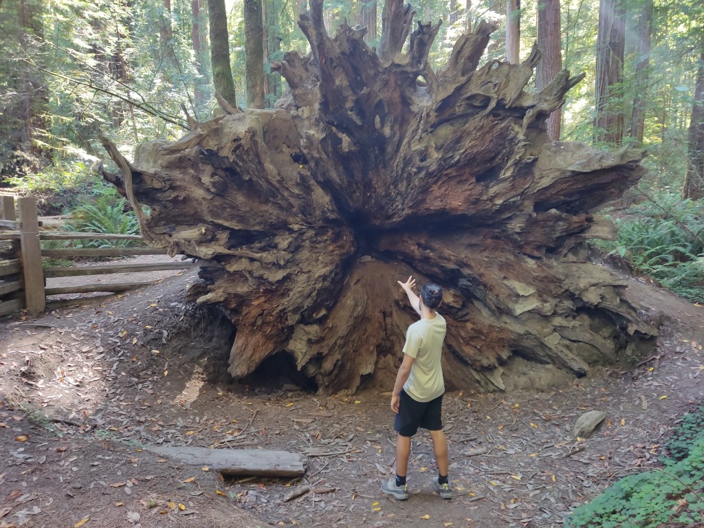 Fem una excursió seguint el Boy Scout trail (unes 5 milles d’anar i tornar). Els arbres de tot el bosc que travessa aquest camí són tots redwoods. Alguns són realment grans i la resta són enormes. Impressionen els arbres caiguts, amb les arrels exposades, com un escarbat panxa enlaire. Tot i tombats, aquests gegants del bosc són més alts que nosaltres. Ens aturem aquí i allà a admirant “l’arbre més gran del bosc”, que queda desbancat pel següent, que s’alça imponent uns metres més enllà. Escalem els gegants caiguts, que jeuen, llargs com són, sobre el terra del bosc o sobre d’altres arbres que vàren tenir la mala sort de trobar-se en el radi d’acció de la caiguda.