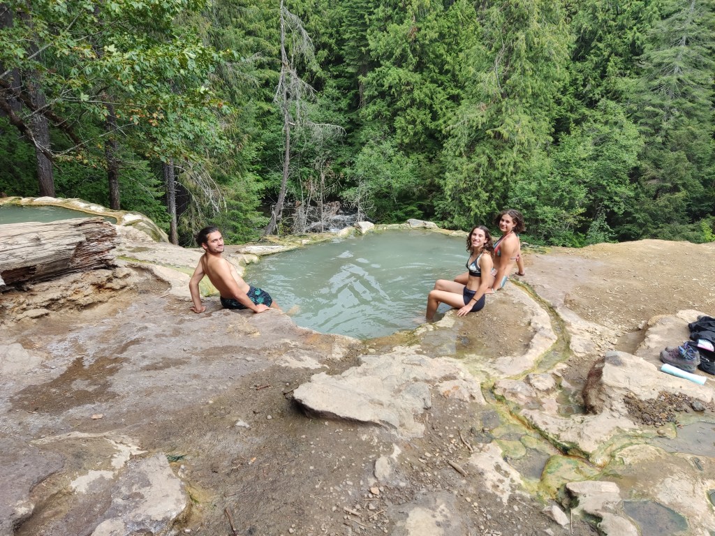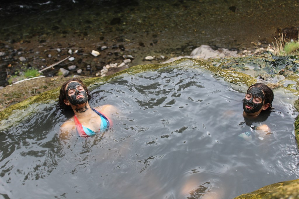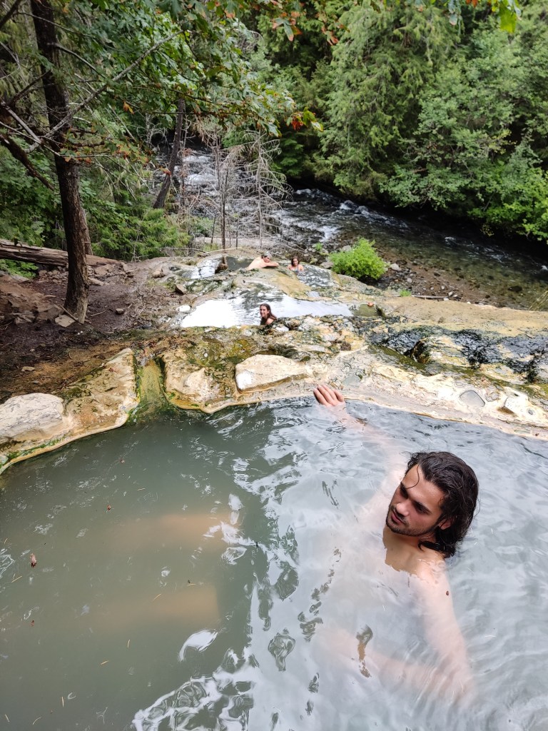 Doncs amb tot el follón no us havia dit res. Estavem buscant unes banyeres d’aigua calenta naturals, les Umpqua Hot Springs, que fan les delícies de la família i ens permet arribar, després de dues hores i mitja més de viatge (recordeu que hem tornat enrrera una hora, doncs ara endavant) a Corvallis, just per disfrutar del sopar que ens han preparat entre el Kai i el Dave.