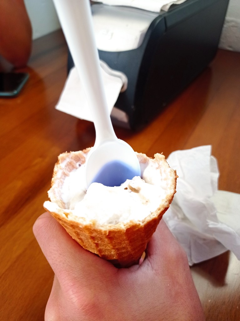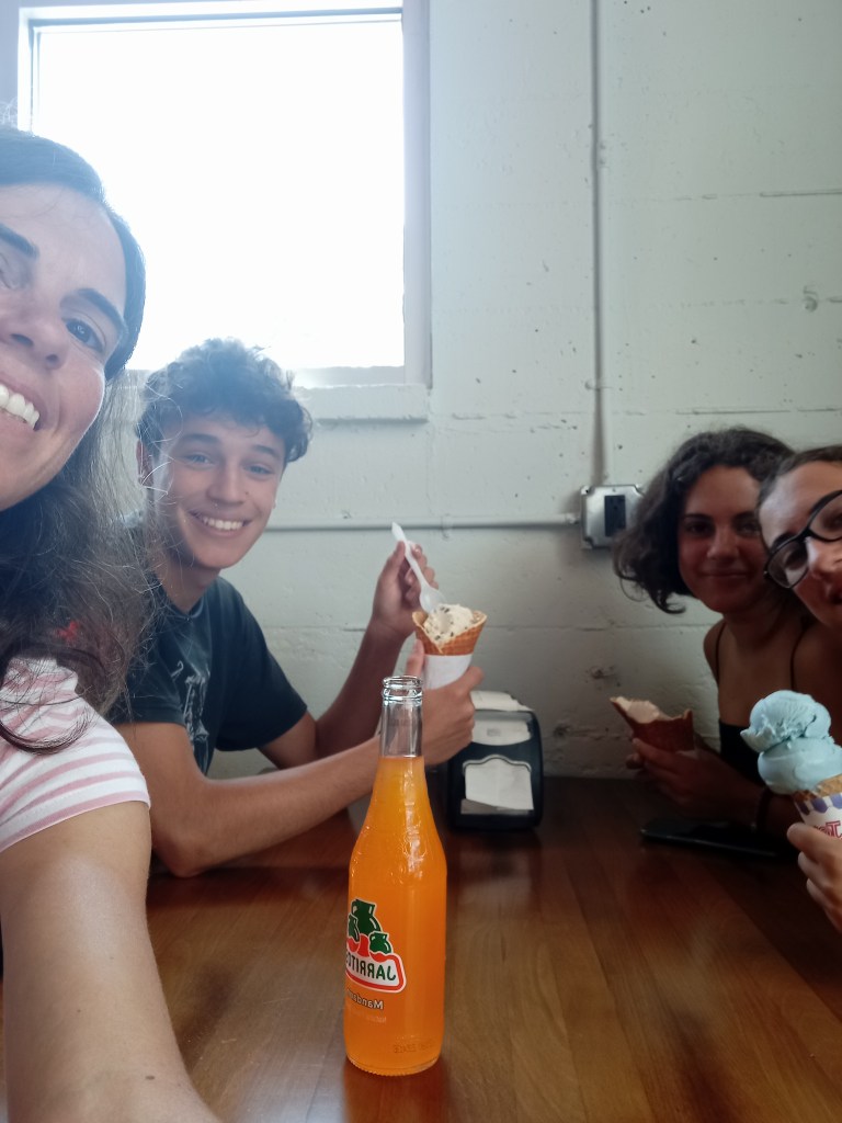 Un cop tenim en Dani acomiadat i l’autobús ha marxat convido als nens a un gelat. No podem perdre l’oportunitat de fer un gelat si la parada de l’autobús està tan a prop de la geladeria més bona de Corvallis. Ens explica l’Anna que els propietaris van innovant l’oferta de gelats cada setmana. Realment tenen gustos ben suggerents.