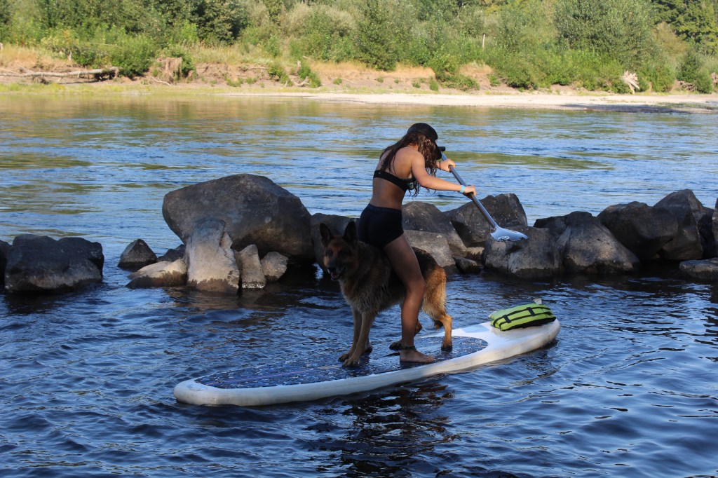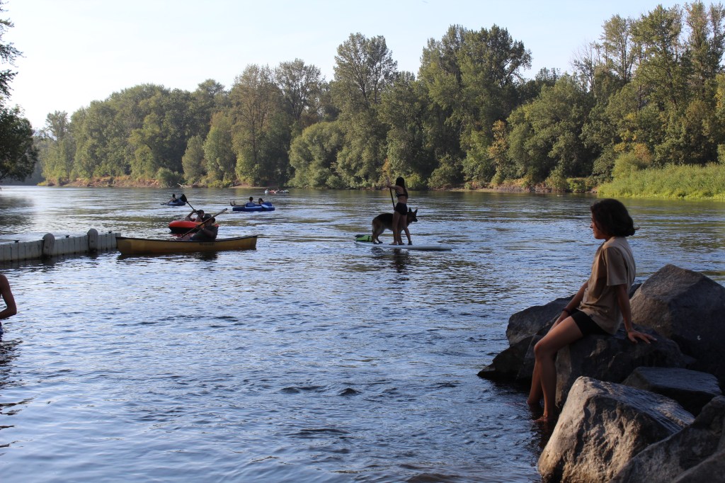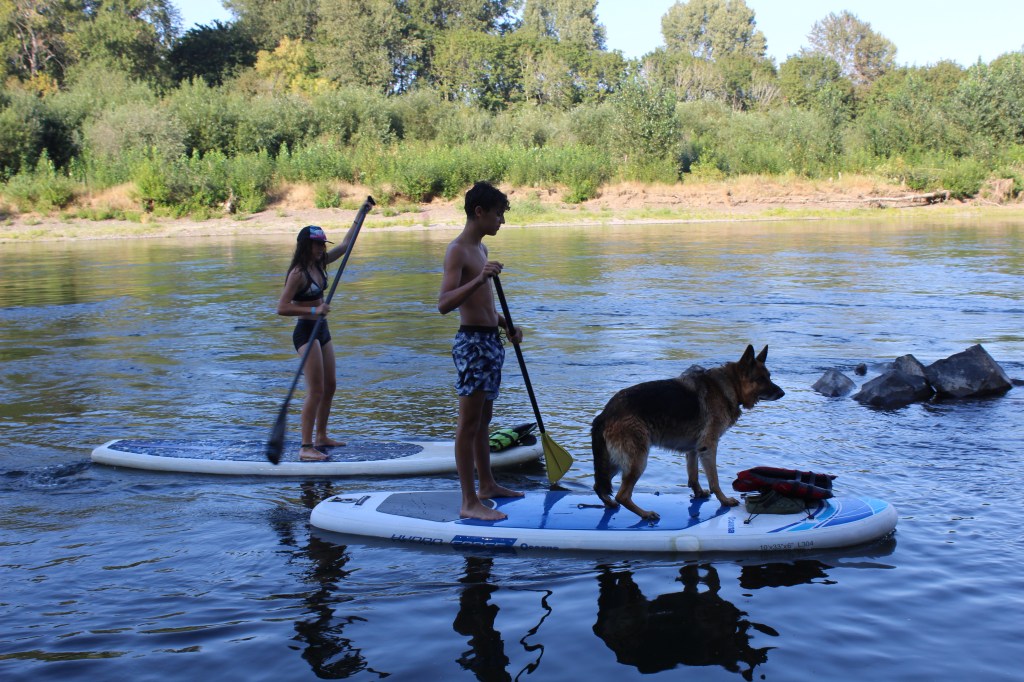 Així que, contents i tranquils, en Marco, la Ona, la Sira, l’Hayduke (el gos gran amant de la natació) i jo hem anat al riu. Ens quedem a la rampa on baixen les embarcacions. Hi ha aparcat el cotxe del sheriff. Prefereixo no temptar la sort i ens quedem prop de la rampa. Sols es banyen la Ona, en Marco i en Hayduke. També remen una estona sense allunyar-se gaire de la rampa. En Hayduke es deleix per pujar a les taules de paddle i en Marco i la Ona el porten, per torns, en mode taxi.