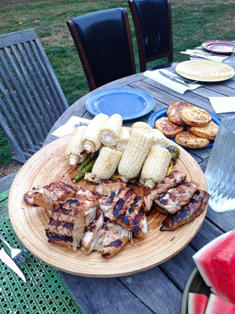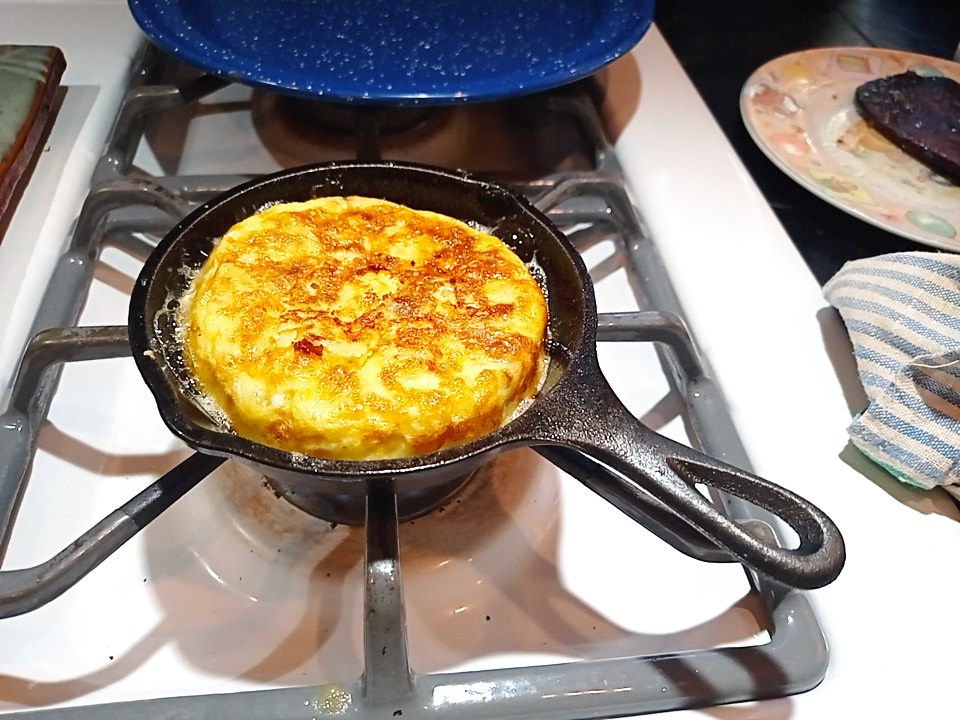 En Dave em proposa col·laborar amb la logística culinària de l’event i, poques coses que em demana, m’hi llenço de cap. Estic temptada a fer truita de patates. El primer intent va ser un desastre del quasi 100%. Els segon intent va quedar en un 40% de desastre. A la tercera ha de ser la bona! Fets els càlculs, arribo a la conclusió que faré truita de patates amb una lleugera modificació en l’acabat final per a reduir el percentatge de fracàs. El principal problema (i crec jo que únic) de l’acabat final és la paella, pesa tan que no puc donar la volta a la truita. Així que decideixo acabar de fer la truita amb una paella a la meva “alçada” i “adaptada a les meves capacitats” (veure fotos). Acaben sortint set mini-truites de patates. A tothom els encanta “So tiny ones, so cute!” (“Què petites, què mones!”) i ens les cruspim sense miraments. La resta de l’àpat és tonyina fresca a la barbacoa i les “sempre-eternes” salsitxes d’elk, que van apareixen sistemàticament (com qui no vol la cosa …) en alguns àpats.
