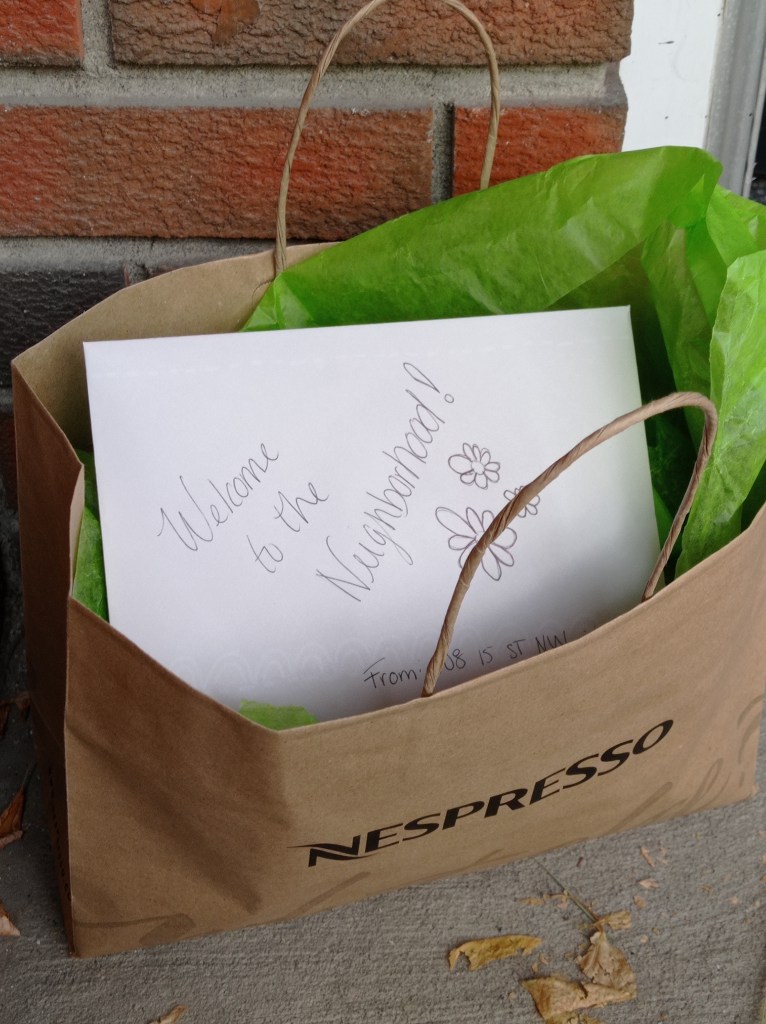 Aquesta setmana ha sigut força dolça. Dimarts, tornant de la feina em vaig trobar un paquetet a la porta de casa amb una postal de benvinguda de part de les veïnes de la dreta. El present va resultar ser una dotzena de magdalenes de xocolata casolanes. Es veu que aquesta no és sols una costum que surti a les pel.lícules, al Canadà real també es fa. No cal dir que vaig córre a casa les veïnes a donar les gràcies!