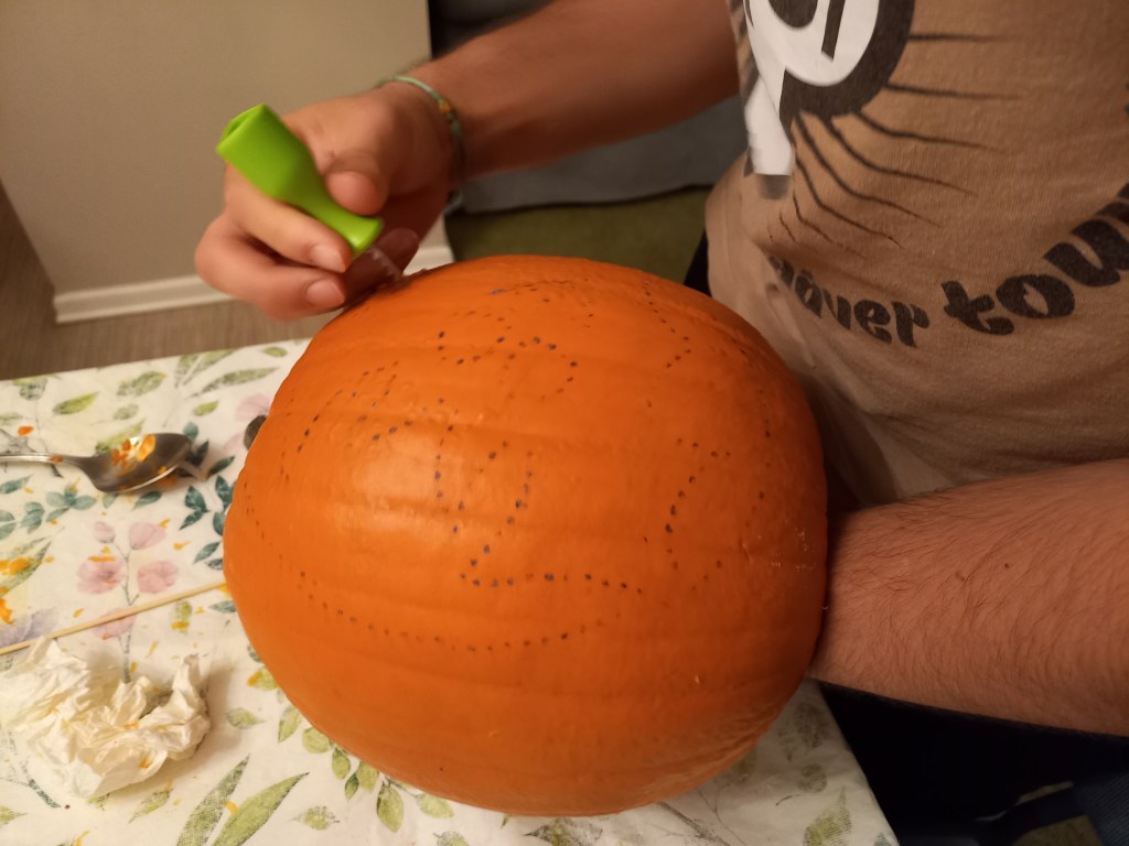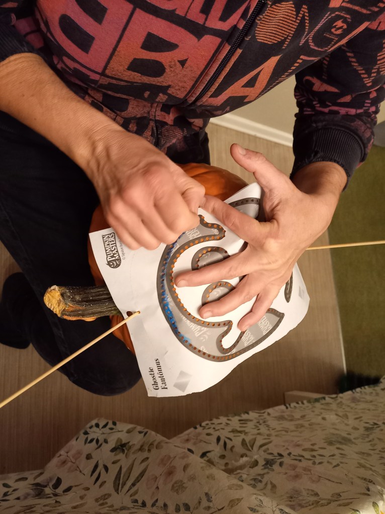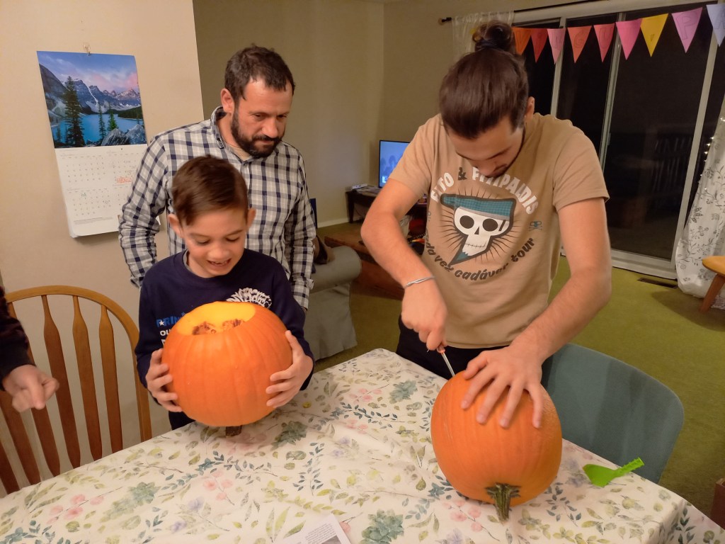 A casa l’Àngels en Diego i en Quim s’han animat a buidar i tallar una mítica carbassa de Halloween. Els ha quedat la mar de bé! La del Diego l’hem posat a l’entrada de casa. Diu la Sira que la llum de dins de les carbasses allunyen els mals esperits de la casa. Doncs res, aquí l’hem deixat, per si de cas!
