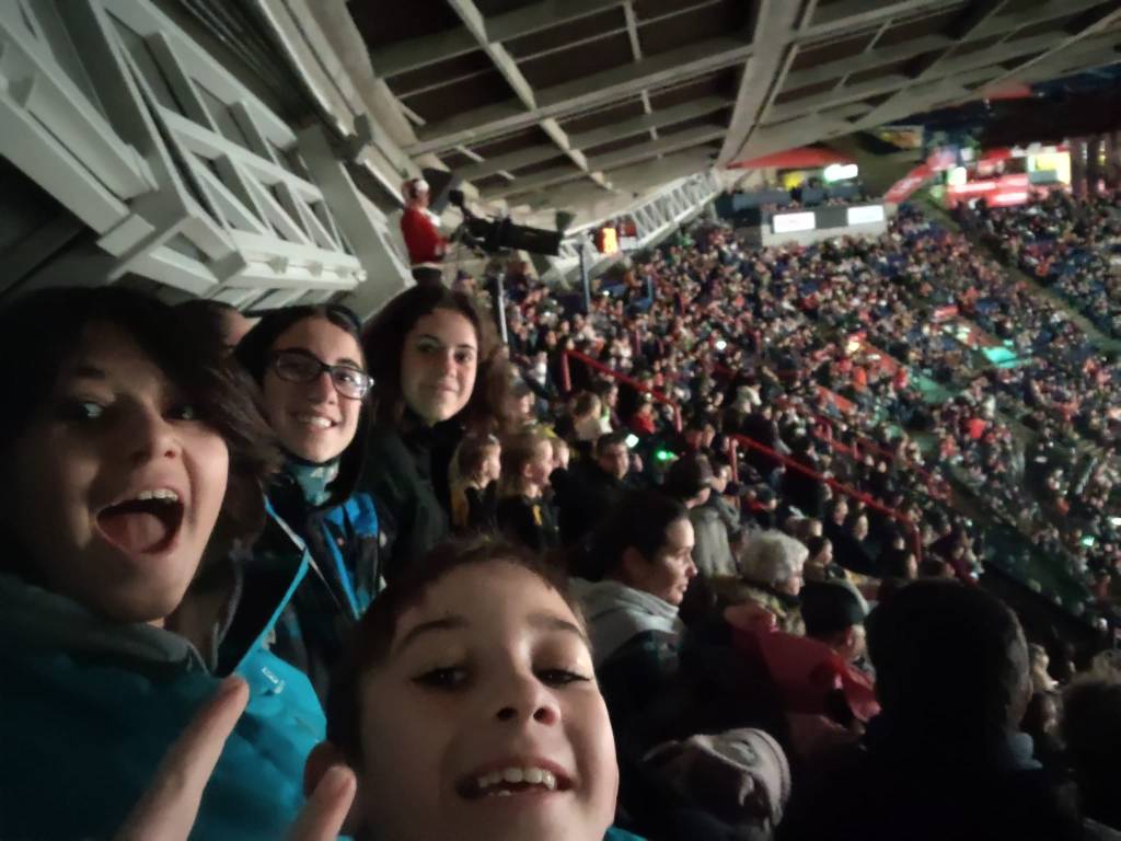 El pavelló és enorme i les nostres localitats són a l’última fila. Estem a dalt de tot i les vistes des d’aquí són realment impressionant. És un partit ben especial i es nota. El pavelló està ple a vessar i pràcticament tot el públic són famílies amb nens petits. Ronda de crispetes amb mantega per a tots els membres de la nostra expedició i comença el partit. L’equip visitant marca al cap de pocs minuts de l’inici del partit, però poc després arriba el gol dels locals i el pavelló es transforma.