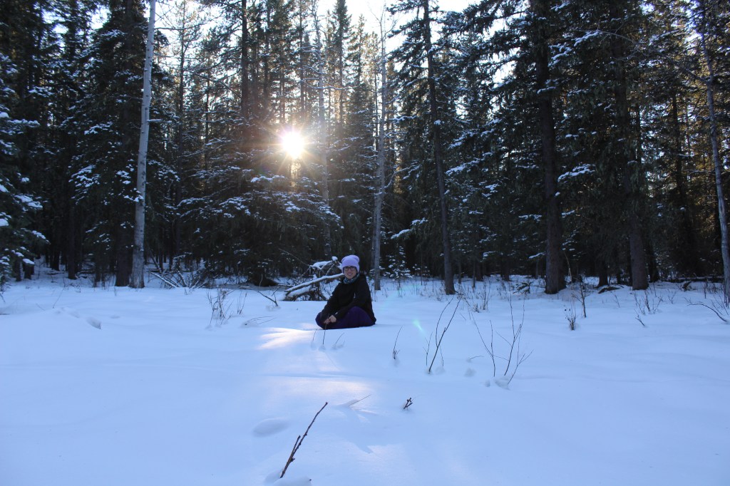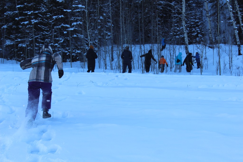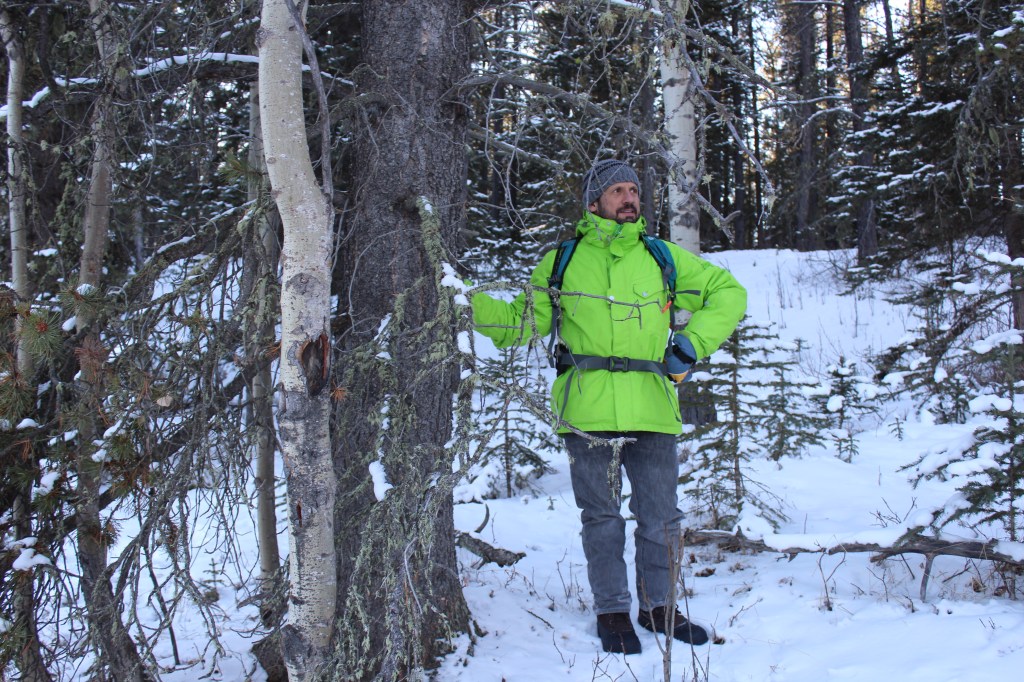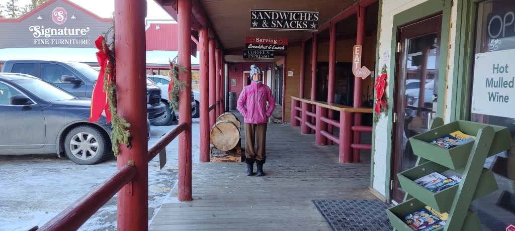 El punt neuràlgic del poble és un aparcament amb els comerços al voltant, tots ells amb un aire de “far west”. Llistons de fusta pintats de diferents colors, una porxada davant de cada establiment i els rètols pintats a mà. Tot molt autèntic. Com sempre! Aquí és on ens trobem amb la resta d’expedicionaris. Amb el cotxe sortim de Bragg Creek i enfilem carretera amunt cap a la muntanya. En un moment donat aparquem al voral del camí i, equipats amb la roba de neu i una petita serra elèctrica, ens endinsem al bosc.