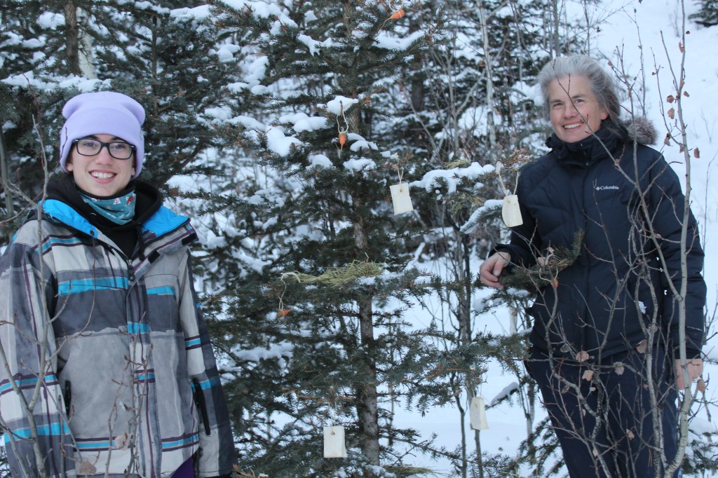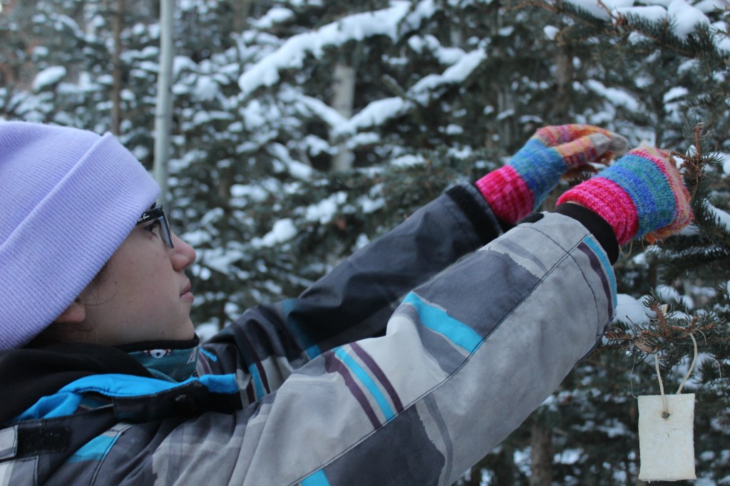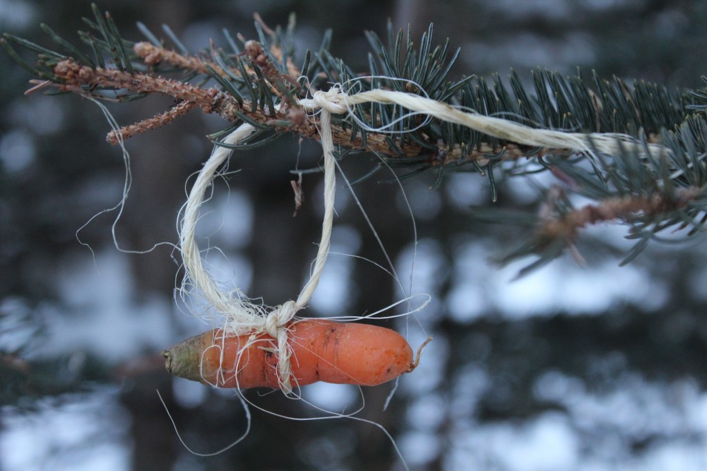 La Nicole, la mare canadenca de la família amfitriona, ens comenta que ha portat “llaminadures” per guarnir un arbre pels animalons del bosc. L’Ona i jo ens apuntem a l’activitat. Es tracta de penjar de les branques d’un arbre pastanagues, naps i farçallets d’herba verda. Tot un festí per a la fauna de la zona. És divertit i l’arbre queda ben bonic.
