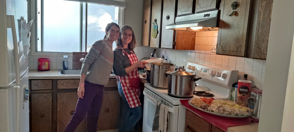 Com a bon dinar de Nadal el menjar estava clar: la Laia havia promès croquetes, unes autèntiques desconegudes al Canadà. L’Àngels faria el caldo i el Phil faria “turkey”, que no té res a veure amb els falàfels o els shawarmes, és un gall d’indi! Sí, clar, ara resulta que tothom ho sabia. Doncs jo no tenia ni idea de què dimonis parlaven fins que el vaig veure. Redéu, quin tros de carn!! En fi, per la seva part la Carmen, amant del menjar, però no de la cuina, va portar postres.