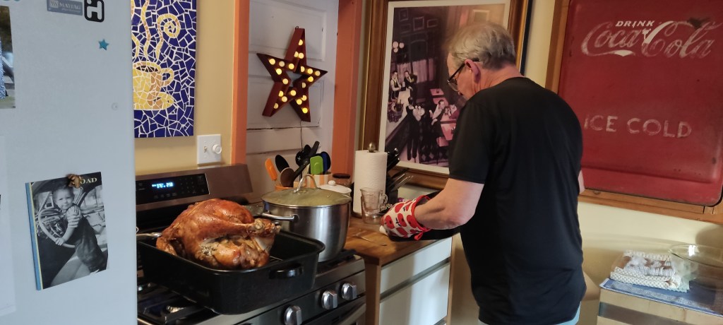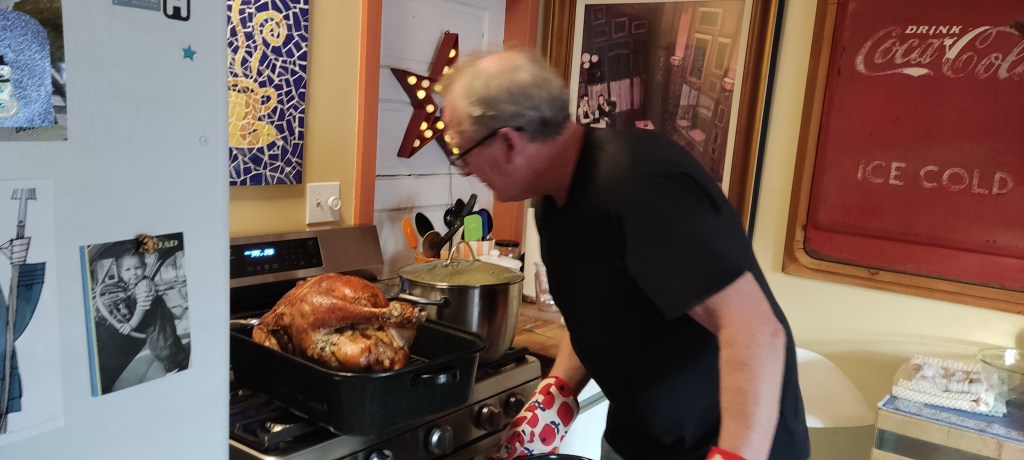 Em va rebre amb el nét corrent amunt i avall de la sala, em va convidar a entrar i va desaparèixer cap a la cuina, mentre jo amb l’ampolla a la mà i intentant no trencar res mentre em treia les sabates (obligatori a tota casa canadenca!). Després de saludar a la corrua de nens que jugaven per la sala, escalfar-me a la llar de foc i fer un reconeixement ràpid de fotos i quadres, el meu amfitrió continuava sense aparèixer, així que seguint l’olor de rostit que feia salivar vaig endinsar-me cap al que semblava la cuina. Allà hi era ell, preparant el seu “turkey”, un animal que feia goig de veure, i tots els complements que l’acompanyaven.