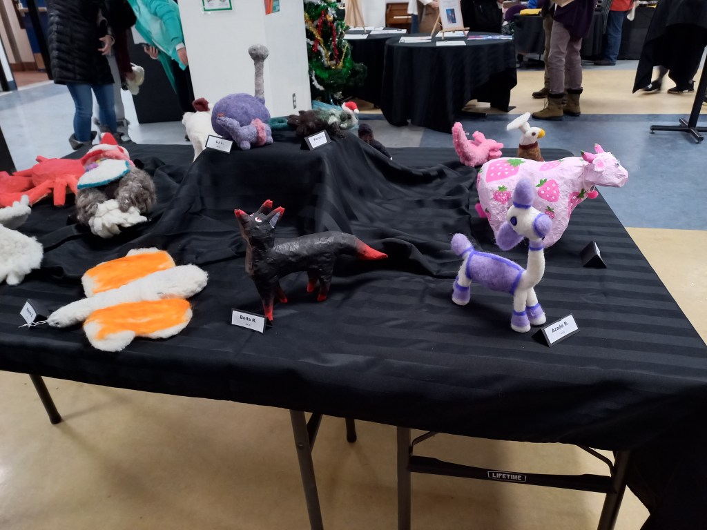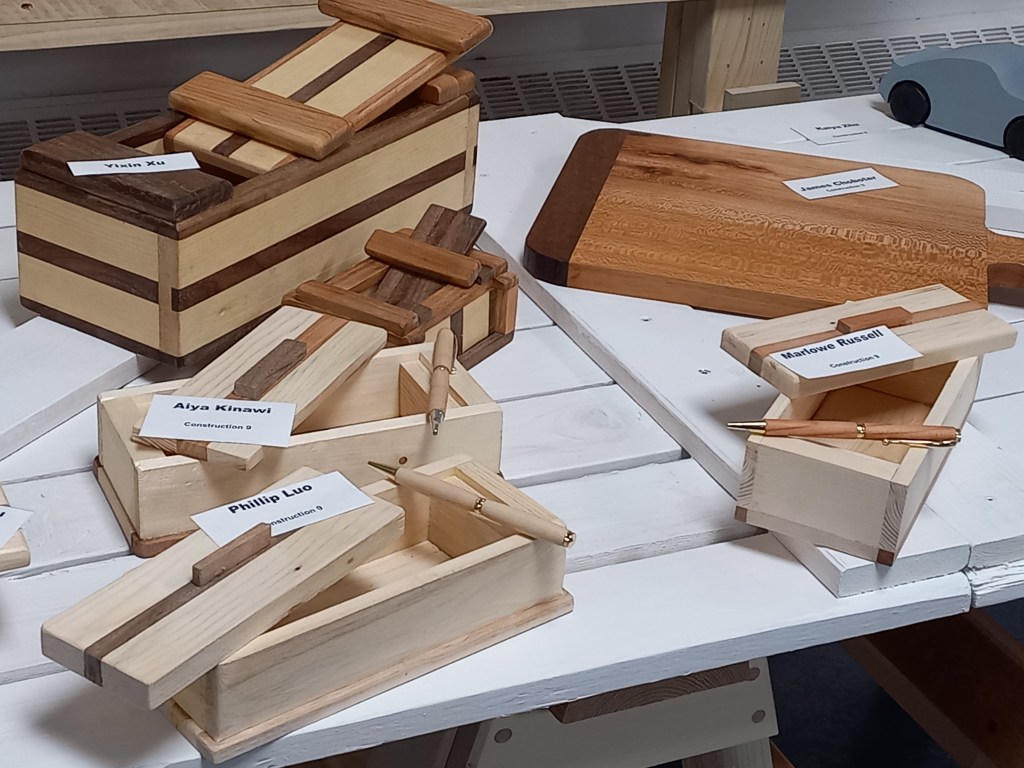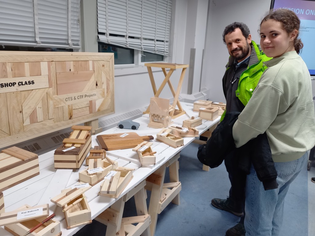 Aquesta nit hem tornat a visitar l’institut de l’Ona. En aquesta ocasió per veure la mostra de diverses activitats que els alumnes desenvolupen a algunes de les classes optatives. Cinema, teatre, fusteria, pintura, fotografia, cuina i, fins i tot, concert de la banda. Quan hem arribat l’institut estava ple de gom a gom. Al vestíbul hi havia l’exposició de les manualitats i paradetes amb degustació de galetes nadalenques. Vàrem quedar bocabadats amb les peces fetes al taller de fusteria. Joaquim: res a veure amb el que fèiem amb els alumnes a l’Aula Oberta … També la banda de música es mereix una menció especial. Olga, Maria José, fliparíeu, són quasi professionals!