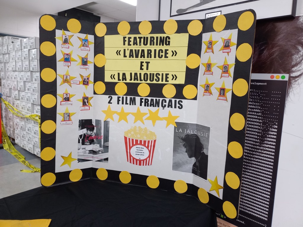 La projecció no decep a un públic entregat (i molt familiar). Acabem tots felicitant actors, actrius, tècnics, directors, escriptors i productors. Tots són presents a la sala, junt amb la professora de francès, que també s’endú la seva ovació. El cas és que la pel·lícula és un projecte del curs de francès i ha estat escrita, interpretada i produïda pels alumnes de la classe de francès. Un èxit rotund.