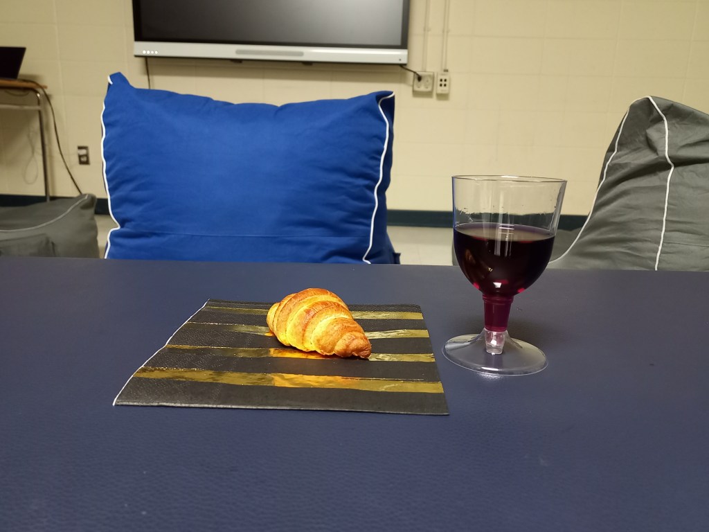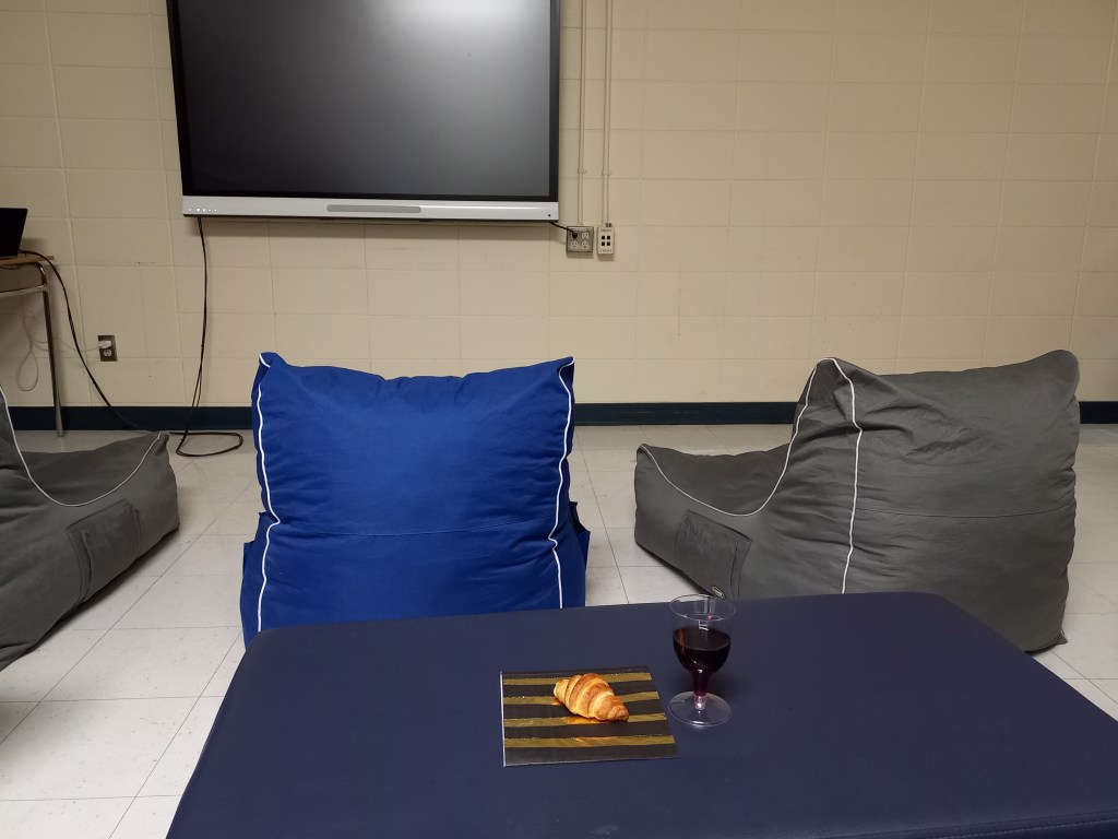 Tot té molt bona pinta, però el nostre objectiu principal aquesta nit és assistir a l’estrena de la pel·lícula de la classe de francès de l’Ona, on ella hi interpreta un dels papers protagonistes. L’entrada a la sala de projecció és gratuïta, però per dos dòlars pots amenitzar la projecció amb una copa de suc de raïm i un croissant al més pur estil francès. Com a bon film de cinema independent francès la sala de projecció és minúscula, amb capacitat per a 10-15 espectadors, tots ben arrepapats a unes còmodes butaques.