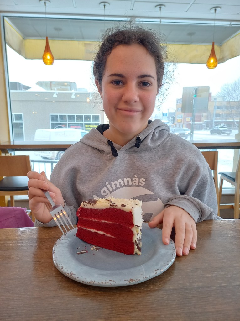 Fa força fred i neva a primera hora del matí. La nostra primera idea de visitar la ciutat queda descartada. Canvi de plans. Veiem la primera part del partit de la final de la copa del món de futbol a l’alberg i després anem a esmorzar a una cafeteria ben original. Ronda de “bagels” i tes per a tots. La Sira triomfa amb un tros de pastís “red velvet”.