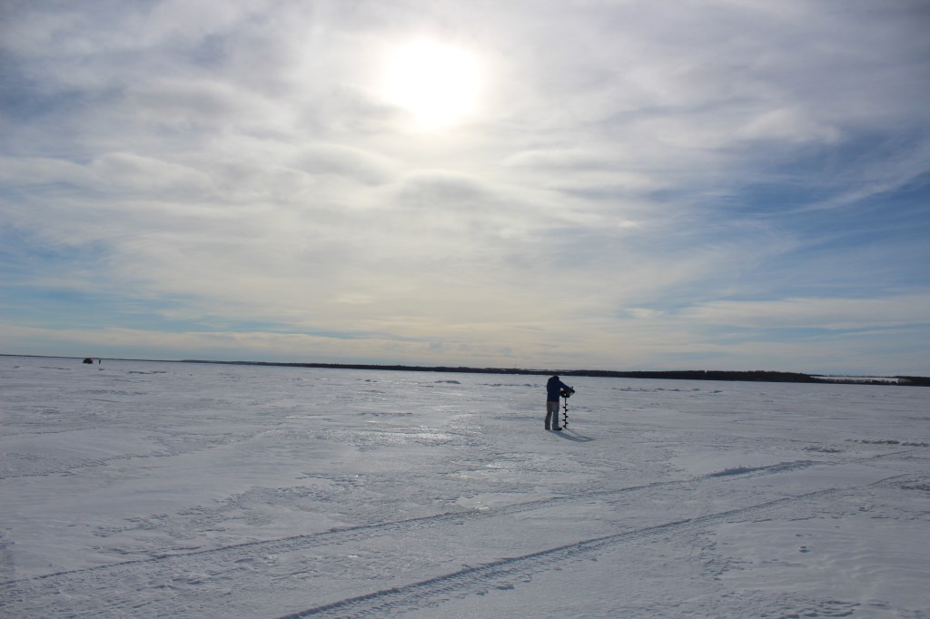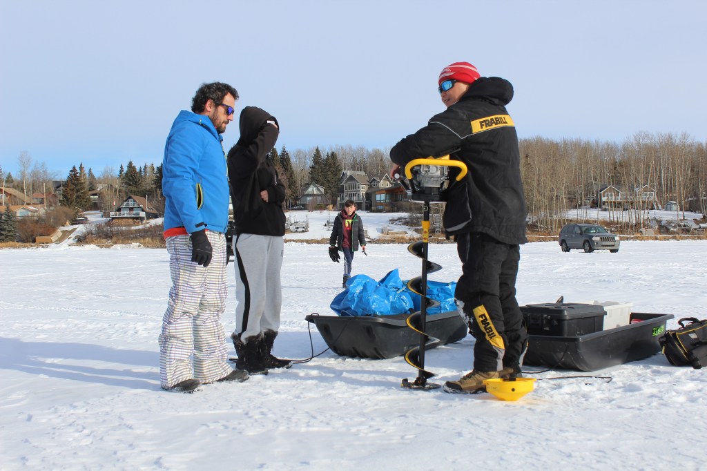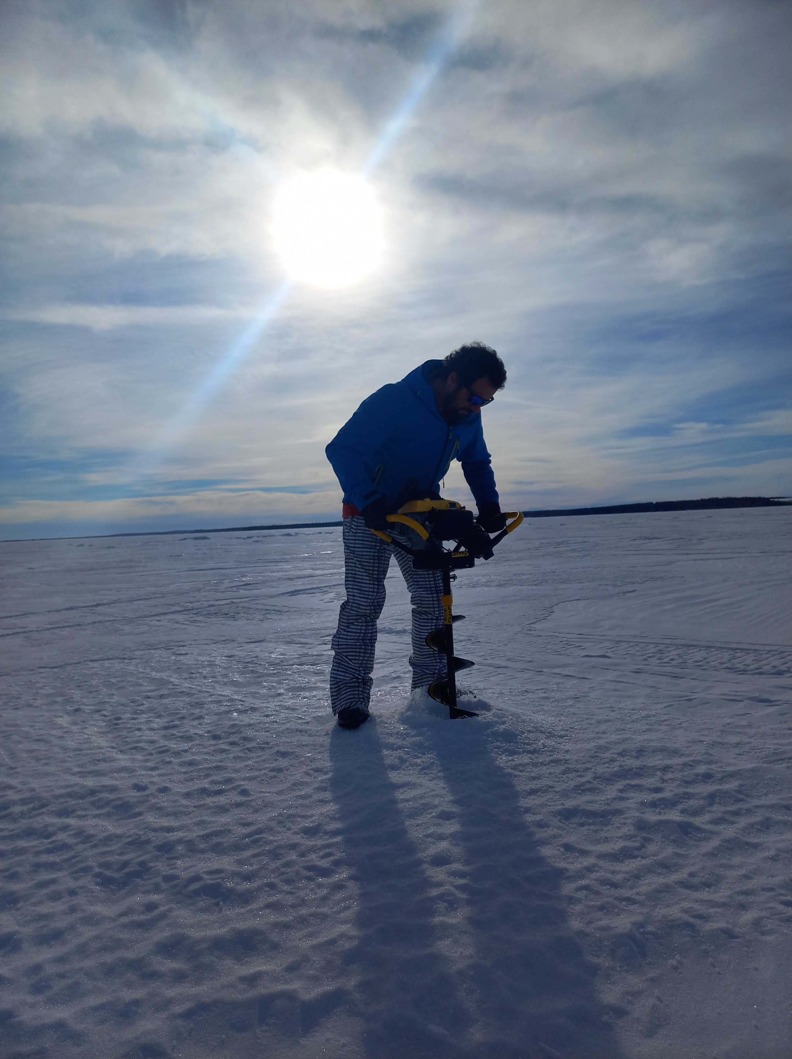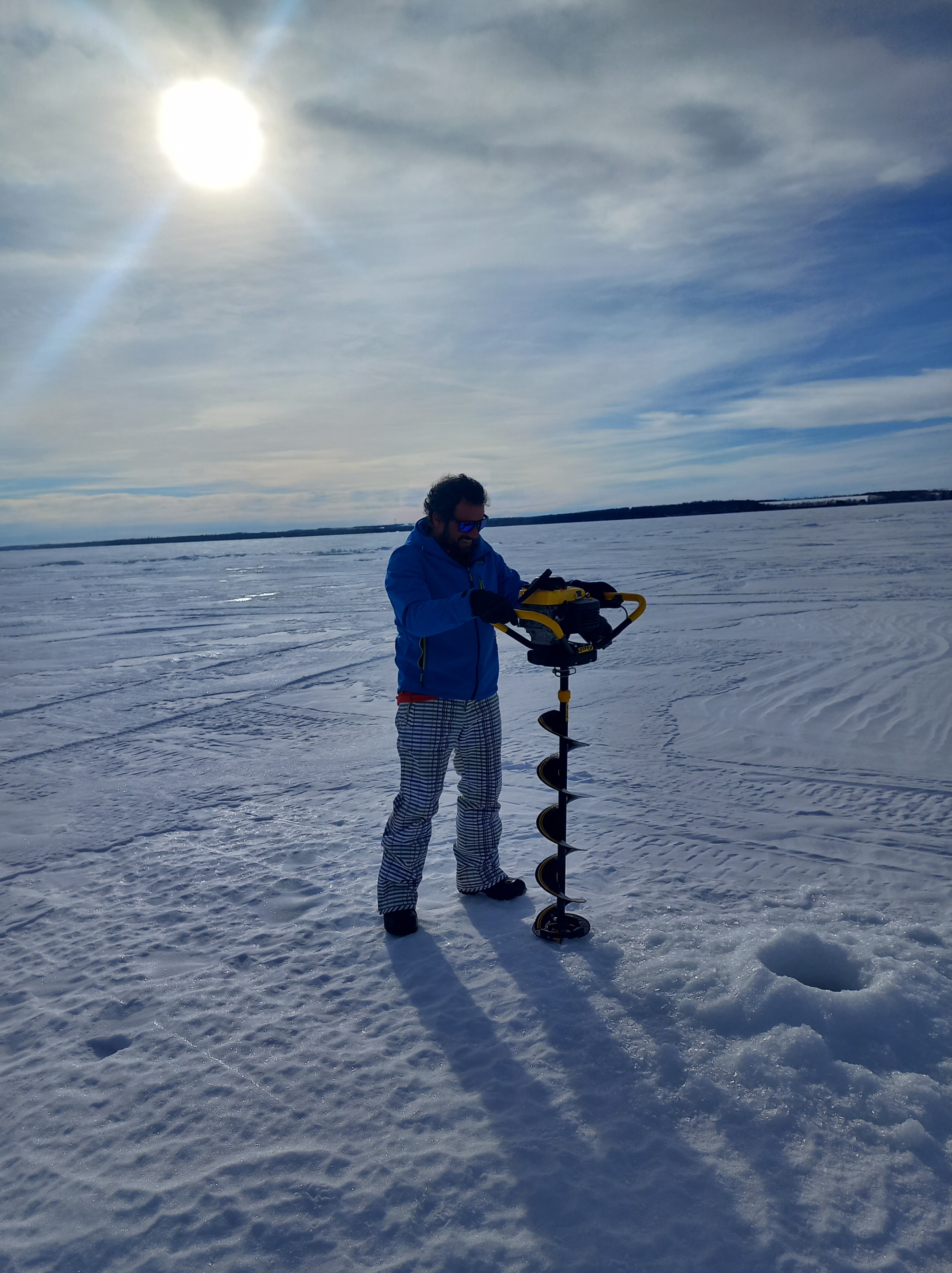 Però a la fi arribem, aparquem i comencem a explorar sense contratemps. No hi ha temps a fer gaire més que el Wayne ja està fent forats amb una megaperforadora per iniciar la pesca. Ens apropem i un cop vist el forat, els que encara tenien dubtes, es queden més tranquils, quasi un metre de gel ens manté a recer de l’aigua del llac. No hi ha perill de res… més o menys.