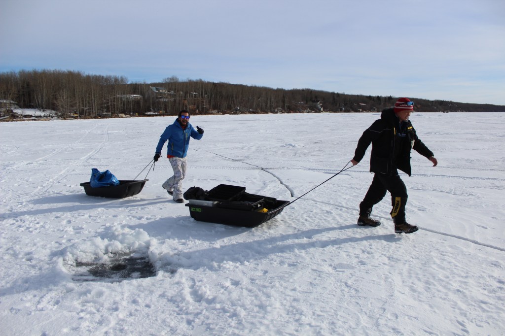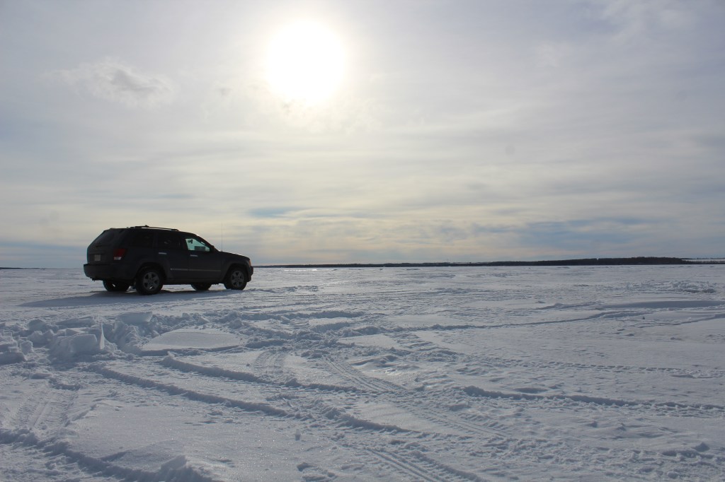 Ens costa tancar la boca, i quan ho fem és per rebre la segona sorpresa del dia. El nostre amfitrió, te la idea d’anar, amb el cotxe (una furgoneta enorme que ha de pesar el doble que el nostre Jeep Gran Cherokee), fins a la meitat del llac on plantarem el nostre campament. Ens aclareix que és segur, però que a partir d’aquell moment, és responsabilitat nostra, tot molt canadenc. No ho tenim gens clar, però mirem el nostre Chinook, el cotxe del Wayne, un altre cop el nostre i ens decidim: cap al gel! Un cop hem escollit ens dona instruccions especials per anar en cotxe per un llac glaçat: cinturons de seguretat fora, finestres obertes, no tocar els frens i distància amb la resta de vehicles tan a l’hora de circular com a l’hora d’aparcar. Donant tranquil·litat són uns cracks.