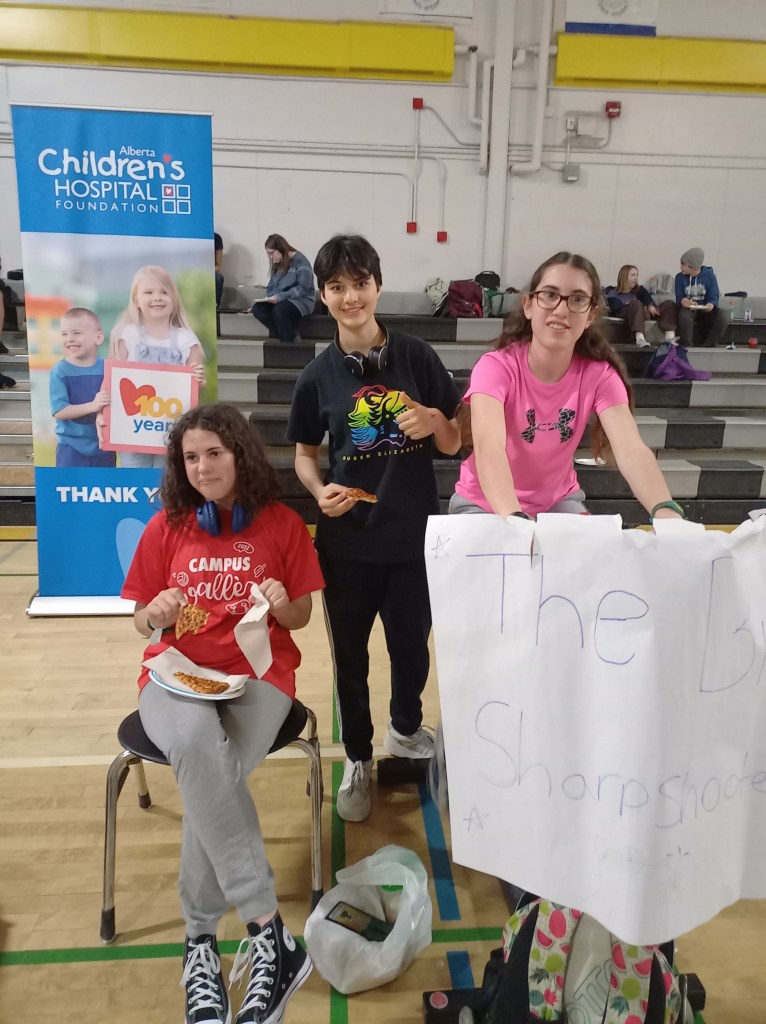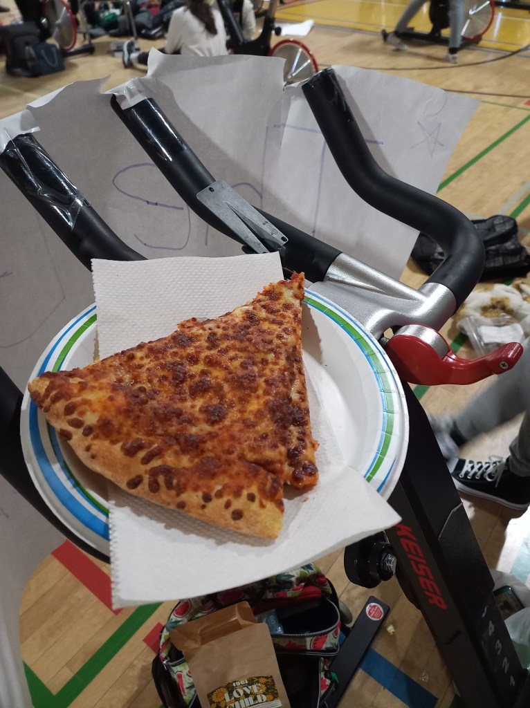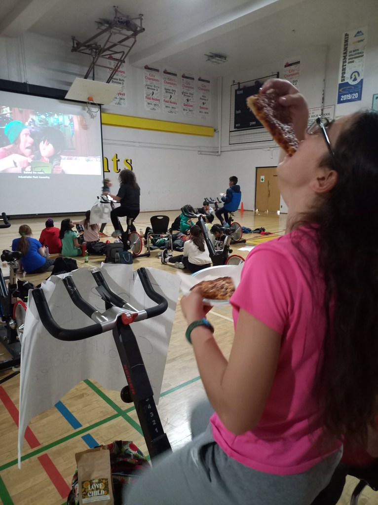 Veure pelis i menjar pizzes era el que menys m’esperava d’un dia a l’institut. El dimarts l’Ona i jo vam marxar a l’institut a fer de tot excepte classes. L’institut va organitzar un acte benèfic per recollir diners per l’hospital infantil d’Alberta. L’activitat consistia a mantenir una bicicleta estàtica activa durant 12 hores. Participaven equips d’entre 4 i 8 alumnes. Començàvem a les 9 del matí i no paràvem de pedalar fins a les 9 de la nit. Per sort, cada equip tenia una bicicleta i anàvem fent torns.