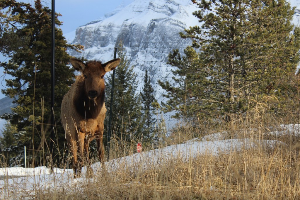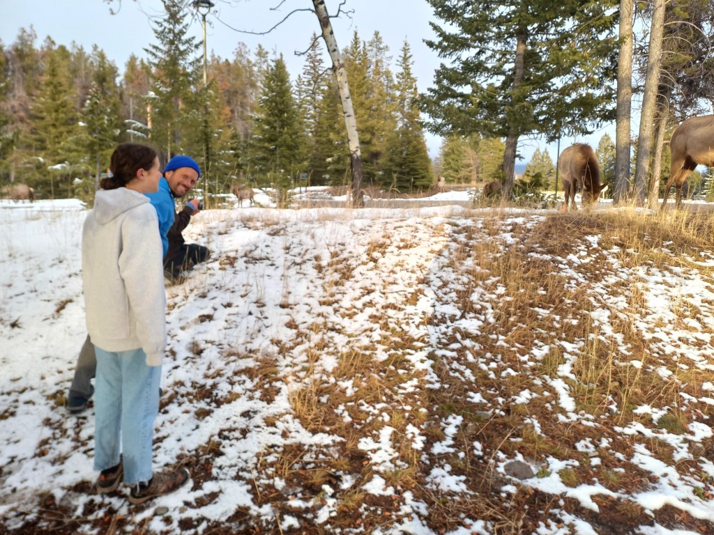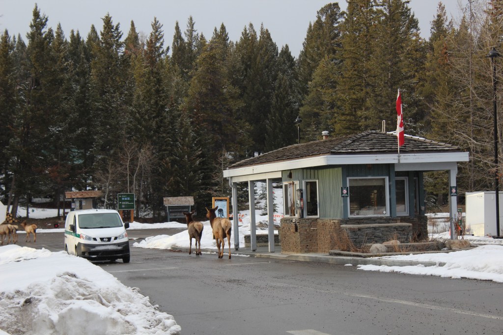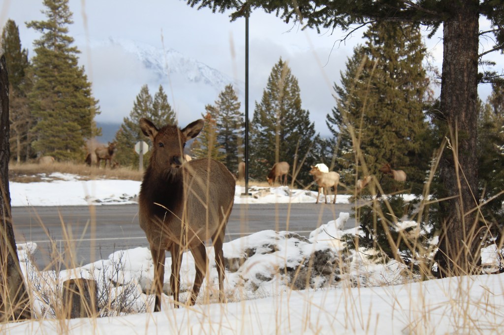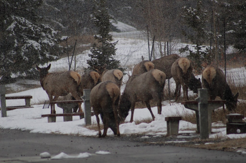 Amb la caravana enganxada al Chinook ens plantem a Banff en una hora i mitja. Ens instal·lem a l’únic càmping obert de la zona, amb les parcel·les cobertes de neu i amb menys d’una quarta part de les places ocupades. La nostra és la caravana més petita de totes. Tota la resta són veritables cases amb rodes. Fa fred i neva, però sortim a fer una volteta pel càmping. La típica frase “Al Canadà la Natura és molt salvatge” agafa força sentit quan ens trobem amb un ramat de uapitís (“elks” en anglès) pasturant per les parcel·les de càmping. Càmera en mà em torno boja fent fotos. Les normes del parc demanen que les persones no s’acostin als animals salvatges, així que anem deixant una distància prudencial a mesura que són les bèsties qui se’ns van acostant a nosaltres, mentre pasturen parsimonioses i despreocupades. Sembla que les herbes més bones són justament les que tenim a sota els nostres peus! L’Ona i jo ens asseiem a una de les taules de pícnic del càmping. Passada l’emoció i la urgència dels primers minuts, veiem que ens hi podem posar còmodes. Posem el mode manual de la càmera i comencem a jugar amb la llum, la velocitat, l’enquadre. Els uapitís resulten ser models pacients i amb moltes possibilitats. Encara neva i al sol li costa fer-se pas entre els núvols. Ens falta una mica de llum per a millorar la captura d’imatges. Ja ens estem posant exquisides amb la sessió fotogràfica!