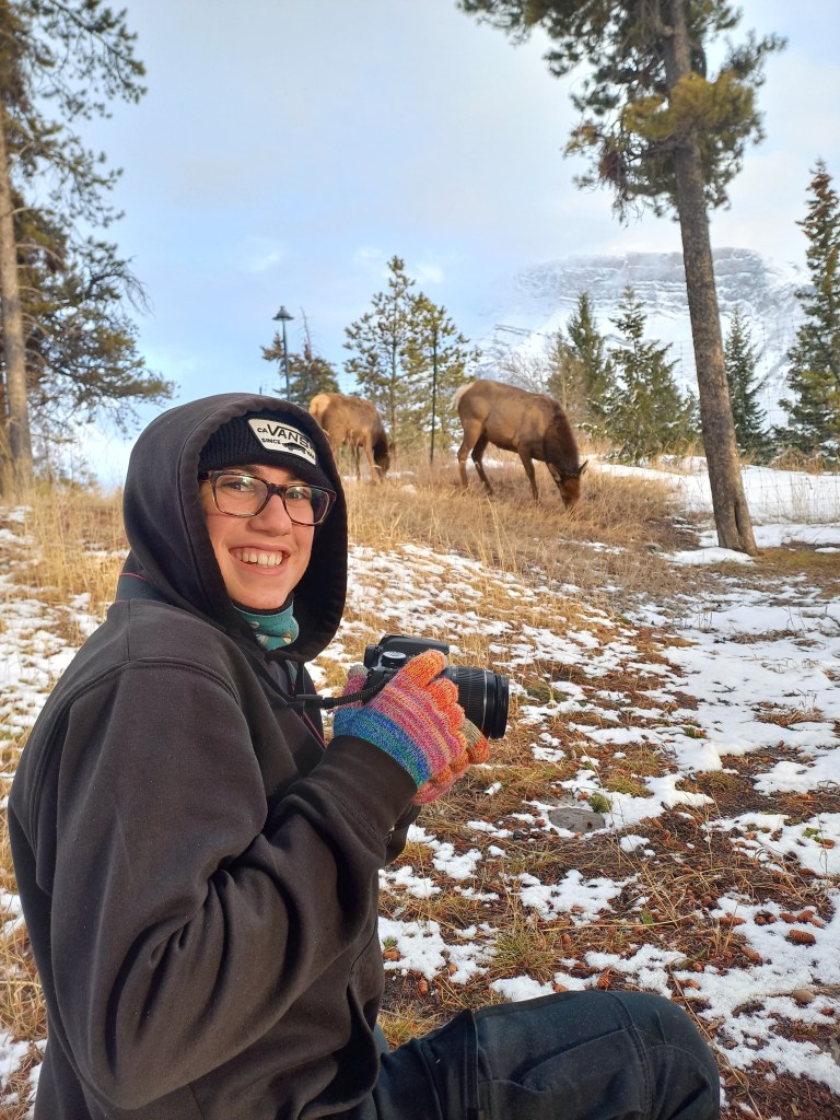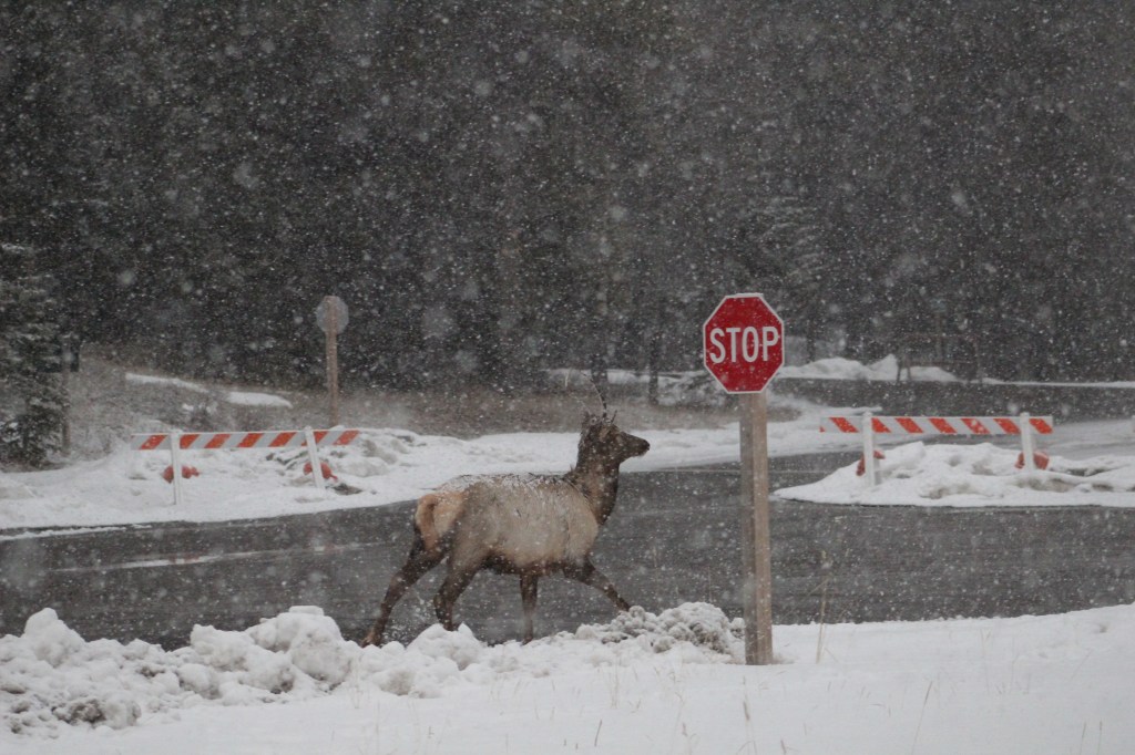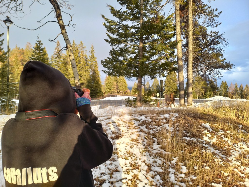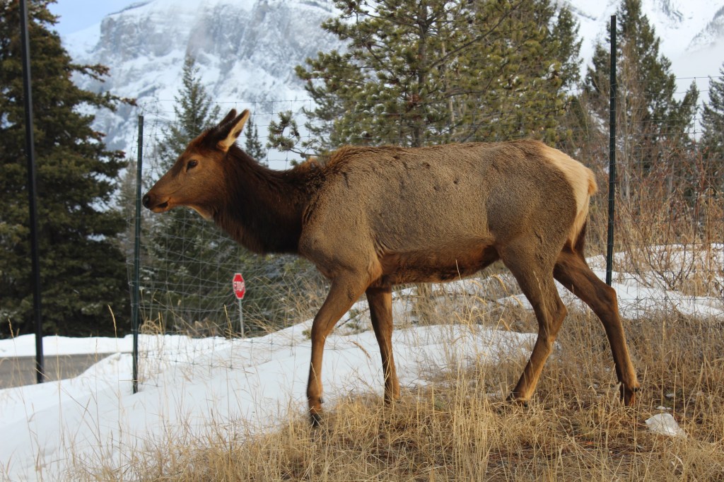 Amb la caravana enganxada al Chinook ens plantem a Banff en una hora i mitja. Ens instal·lem a l’únic càmping obert de la zona, amb les parcel·les cobertes de neu i amb menys d’una quarta part de les places ocupades. La nostra és la caravana més petita de totes. Tota la resta són veritables cases amb rodes. Fa fred i neva, però sortim a fer una volteta pel càmping. La típica frase “Al Canadà la Natura és molt salvatge” agafa força sentit quan ens trobem amb un ramat de uapitís (“elks” en anglès) pasturant per les parcel·les de càmping. Càmera en mà em torno boja fent fotos. Les normes del parc demanen que les persones no s’acostin als animals salvatges, així que anem deixant una distància prudencial a mesura que són les bèsties qui se’ns van acostant a nosaltres, mentre pasturen parsimonioses i despreocupades. Sembla que les herbes més bones són justament les que tenim a sota els nostres peus! L’Ona i jo ens asseiem a una de les taules de pícnic del càmping. Passada l’emoció i la urgència dels primers minuts, veiem que ens hi podem posar còmodes. Posem el mode manual de la càmera i comencem a jugar amb la llum, la velocitat, l’enquadre. Els uapitís resulten ser models pacients i amb moltes possibilitats. Encara neva i al sol li costa fer-se pas entre els núvols. Ens falta una mica de llum per a millorar la captura d’imatges. Ja ens estem posant exquisides amb la sessió fotogràfica!
