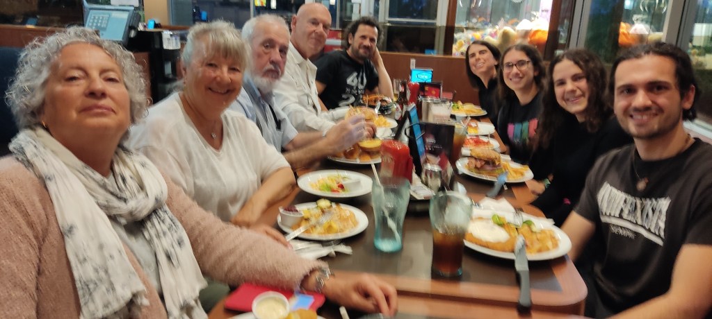 I sense adonar-nos-en arriba la segona visita. Ja tenim aquí al Rafel, cansat i remugant per la rebuda canadenca, però content de veure tothom. Els nuvis han arribat aquesta mateixa tarda, així que per celebrar que hi som tots, anem al Denny’s a fer un sopar de benvinguda i comiat, que el Diego ens deixa una altra vegada, per marxar ara a Quebec, que Canadà és molt gran.