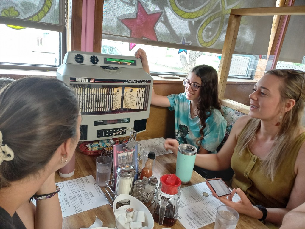 A les parets cartells de pel·lícules, fotos i anuncis de l’època combinen a la perfecció amb el tocadiscos dels setanta que domina una de les cantonades del local. El local està mig ple, i la sensació és de tranquil·litat absoluta. Després de dubtar una mica seiem en una gran taula on ens encabim els 8 a l’espera que arribi l’Ivan, que va molt enfeinat, com sempre. Per la nostra sorpresa cada taula té el seu propi tocadiscos, però ens adverteixen que no van gaire bé i que millor fer servir el gran que ja hem vist abans. No tocarem res, que la música que sona ja ens agrada.
