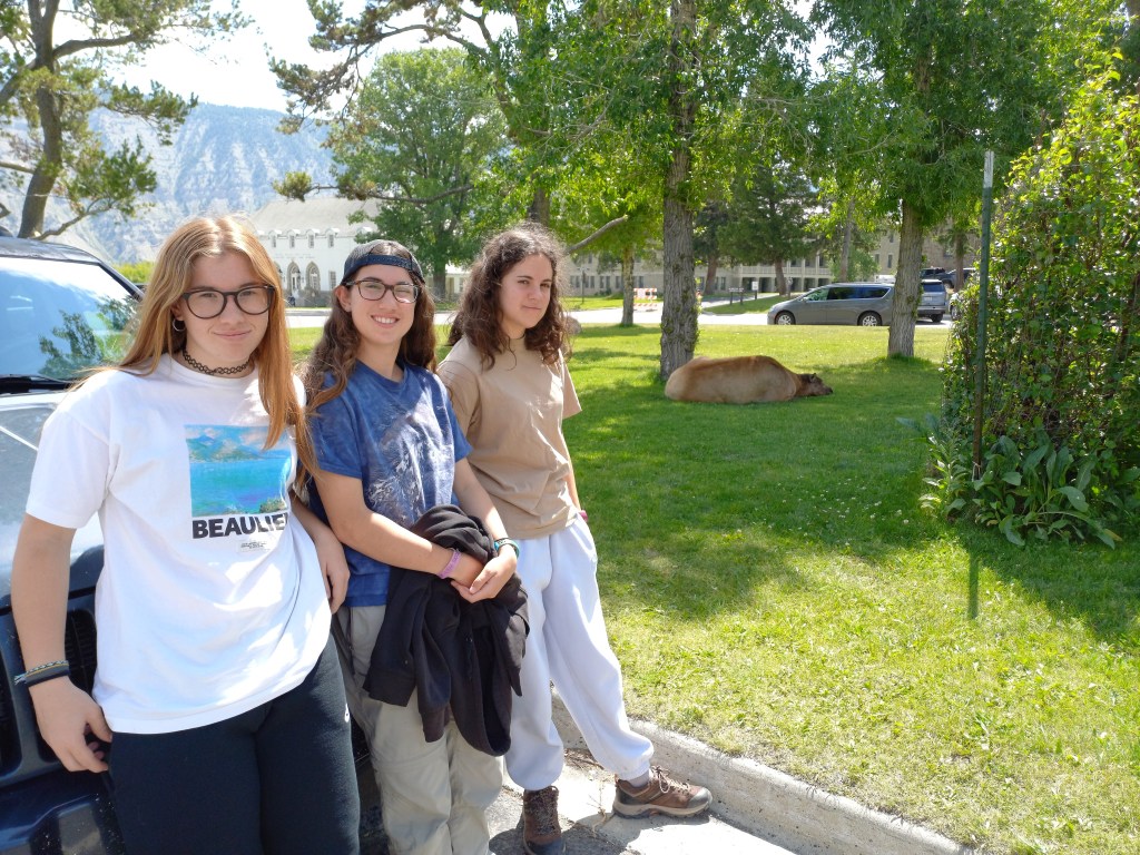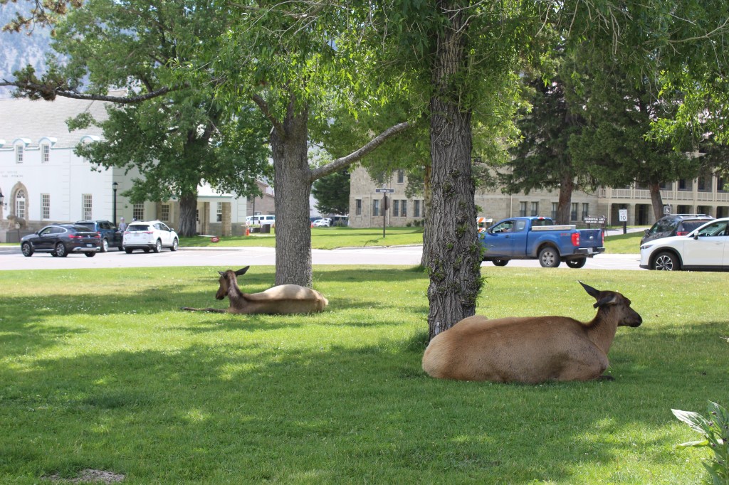 Així que aquí estem, a punt d’explorar Yellowstone. Entrem per Gardiner (al sud de Montana), l’entrada nord del parc, i anem directes al primer centre d’interpretació. Aparquem davant de l’edifici, al costat d’unes quantes elks que descansen tranquil·les sota l’ombra dels arbres. Un rànger uniformada de cap a peus recorda amb un megàfon als visitants més agosarats que els elks són perillosos i que cal deixar una distància prudencial. Als fulletons i cartells s’especifica que aquesta distància és de 25 metres. Siguem realistes, és impossible respectar aquesta distància tenint en compte que els animals jeuen a menys de 20 metres de la porta d’entrada a l’edifici del centre d’interpretació i a 5 metres de les places d’aparcament. Fem les primeres fotos de “guiri” total amb les elks com a protagonistes.