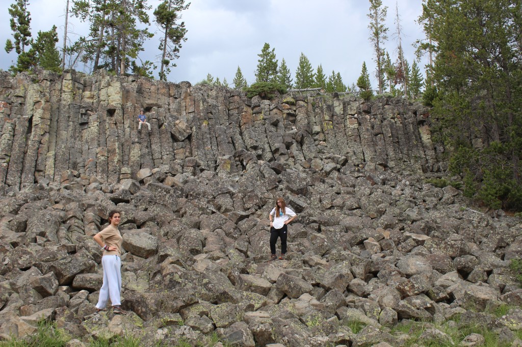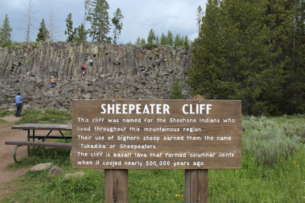 Davant mateix del centre d’interpretació hi ha les Mammoth Hot Springs (aigües termals). Són un espectacle. Passegem pel recorregut de passarel·les sobre la zona. Fa molta calor. El sol pica de valent i les aigües termals desprenen també calor. Una de les adolescents comença ja a rondinar. Estirem la passejada tot el que podem i tornem al cotxe per a continuar el circuit, amb la promesa de parar a dinar a la primera zona de pícnic que trobem. Parem al pícnic de Sheepeater cliff que té unes formacions de roques prismàtiques de basalt. Són també un espectacle.
