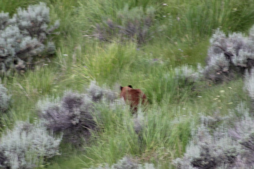 Acabem de fer la volta al circuit del nord, contemplant l’espectacle des del cotxe. Elks, cérvols, antílops nord-americans i algun bisó van apareixent mimetitzats dins el paisatge espectacular de prats, llacs, muntanyes i boscos frondosos. A pocs quilòmetres de la sortida del parc caminant “discretament” entremig d’uns arbustos apareix, com qui no vol la cosa, el meu primer os. No tenim gaire de temps de fotos ni vídeos. Sols els segons necessaris per identificar-lo com a grizzly jovenet. Un altre ítem que marco com a “fet” a la llista de “coses per veure”. Deixem el parc amb la tranquil·litat de poder tornar-hi demà. Hi ha tant per a veure!