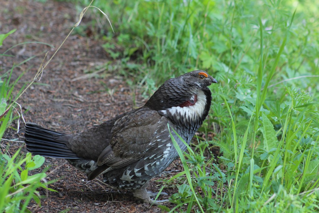 Com ja sabíem, la ruta va tota de pujada sense donar gaire marge fins al cim del Sepulcher per tornar a baixar després. Els pendents no són gaire fort, però no donen treva. El camí, marcat sense opció a perdre’s transcorre entre boscos espessos, petits llacs i algun prat. Ens trobem amb la fauna salvatge esperada: esquirols, chip moncks, cabres i una espècie de gallina salvatge que tracta de defensar amb audàcia el seu territori. Anem tota l’estona alerta amb l’esperança i la por de trobar-nos a l’os, però aquest tampoc serà el dia.