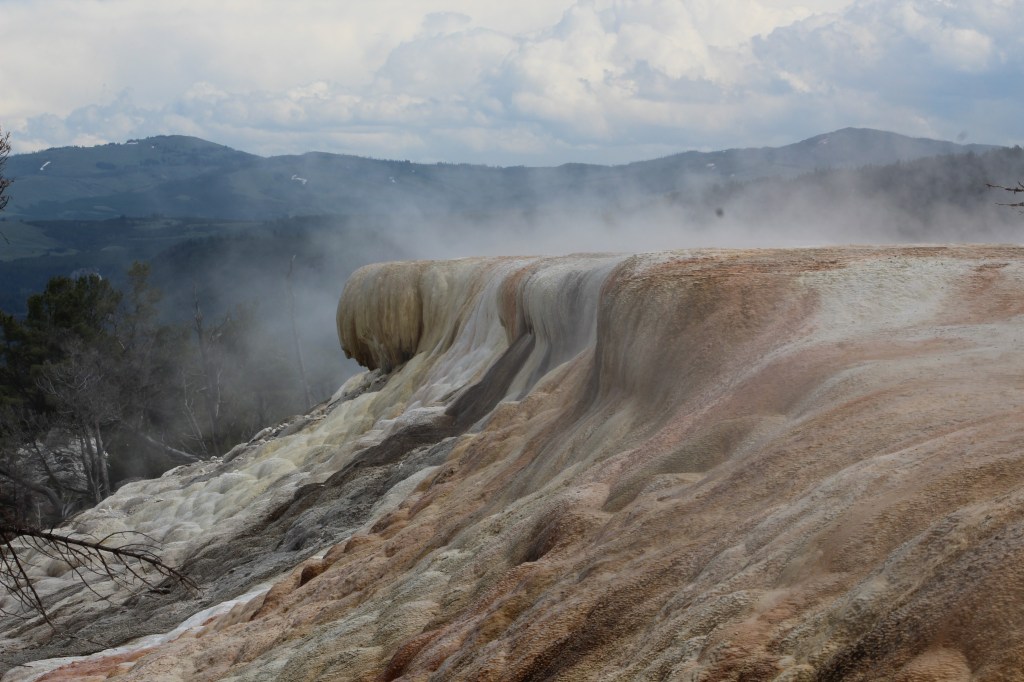 Donat que són uns 18 km amb uns 1.000 m de desnivell acumulat, la Sira i la Berta decideixen quedar-se al càmping aprofitant el bon dia que fa per recuperar el temps perdut a les xarxes socials. La resta ens tornem a endinsar al parc en cotxe (clenc, clenc, clenc!, va dient el Chinook) fins a Mammoth, a l’entrada nord on el deixem entre una gentada de por que va a veure les aigües sulfuroses que ja vam visitar abans-d’ahir.