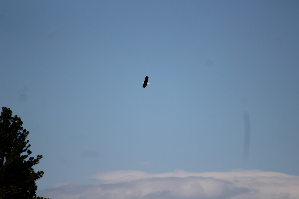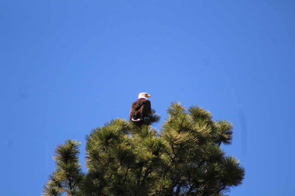 Guiats per un troç de paper amb quatre anotacions i un croquis prou aproximat de la zona (no tenim Google Maps), arribem a un llac. La calor de la tarda i el camí polsegós convenç a les adolescents per remullar-s’hi. Aprofito per voltar per explorar la zona. Una fressa de plomes a vol rasant em frega el clatell i, en veure una ombra gegantina projectada sobre meu alço la vista en el moment just en el qual un rapinyaire de dimensions descomunals remunta el vol i es posa sobre la branca més alta d’un arbre al marge del camí. Majestuosa, imponent, em guaita amb cert desinterès des de la seva talaia. És un “bald eagle”, pigarg americà (Haliaeetus leucocephalus). Roman impassible. Aprofito per fer-li fotos. El tinc a menys de 20 metres. Al cap d’una estona emprèn el vol cansat de posar de mil maneres diferents. Sobrevola el llac a la recerca de la pesca del sopar. Nosaltres també toquem a retirada. Les adolescents s’estrenen en les seves pràctiques de conducció fent votar el Chinook per la pista al voltant del llac de retorn al poble. Certs moments de pànic personal prou ben continguts.