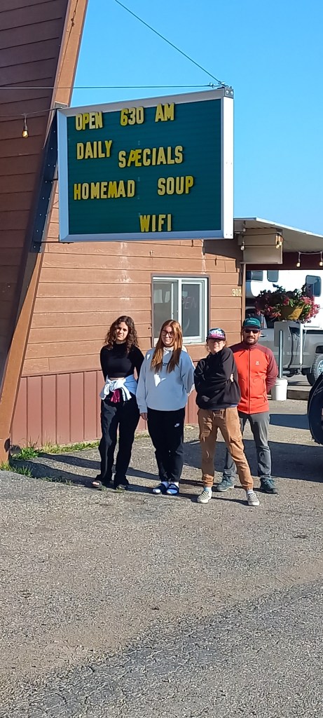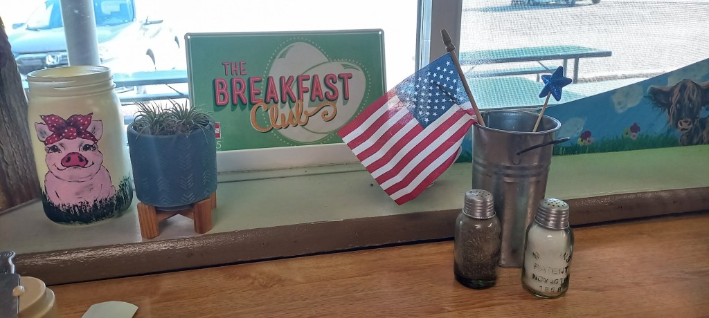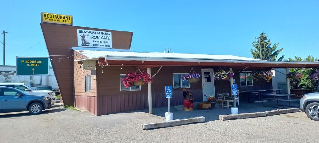 Avui esmorzem al Branding Iron Cafe. El vàrem veure ahir, a peu de carretera, mentre buscàvem el càmping i en vaig fer nota mental. La recepcionista del càmping, a més, ens l’ha recomanat. Des de fora diries que és la típica taverna de “cowboys”, des de dintre és un viatge al passat. Les adolescents hi entren contentes: Wifi i esmorzar de forquilla, res a objectar. La cambrera, que deu rondar els seixanta, perfectament mimetitzada amb la decoració del local, ens rep amb un somriure d’orella a orella. La clientela ens repassa de dalt a baix, recordant-nos que som en un poblet perdut al bell mig de Montana. L’oferta d’esmorzars de forquilla no decep: ous, panqueques, salsitxes, pernil, “maple sirope” i batuts. Ens cruspim un àpat de bandera i sortim, òbviament, rodolant del local. Disposats a continuar cap al nord, camí de la frontera.