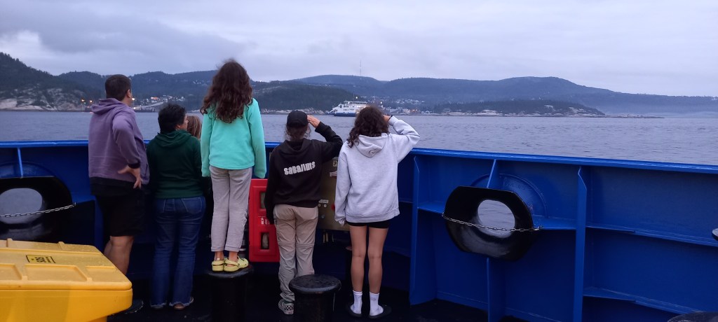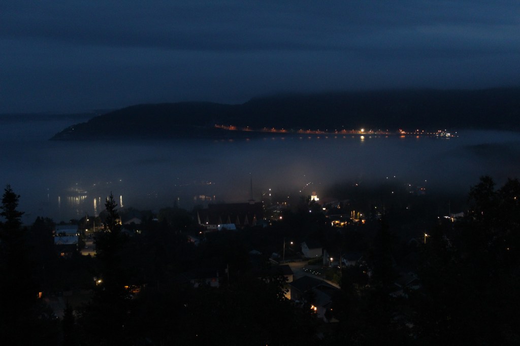 Arribem mentre cau la nit, però encara ens dona temps a quedar-nos embadalits veient, entre la boira, el poble de Tadoussac als nostres peus, covertint-se en un poble fantasma, amb llums de penombra que no sabem si son cases o vaixells.