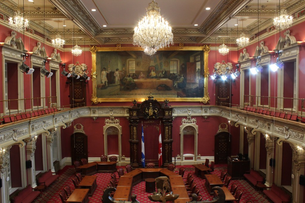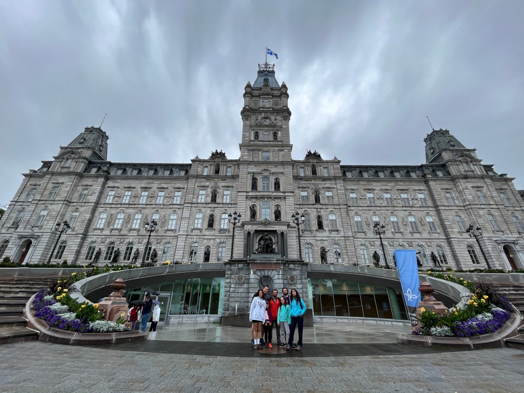 L’endemà ens aixequem i cap al Downtown una altra vegada, que tenim visita guiada al parlament de la província. El dia s’assembla més al que ens esperàvem, rúfol, gris i amb un xiri-miri que només emprenya una mica. Recollim al Diego (o ell ens recull a nosaltres), que ha vingut pel seu compte des de Montreal i ens passem el matí descobrint la història i meravelles de la política local. Les múltiples referències al fet diferencial del Quebec fan les delícies del Diego, la resta ens sentim força identificats.