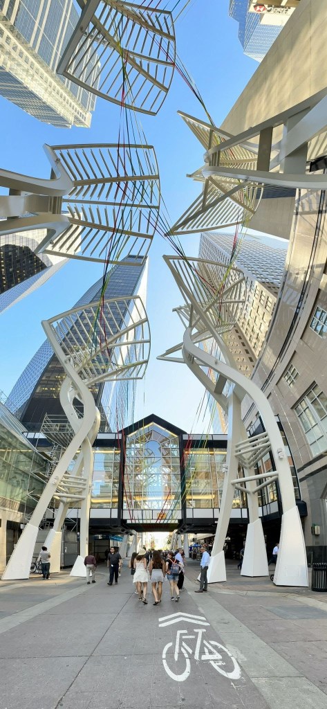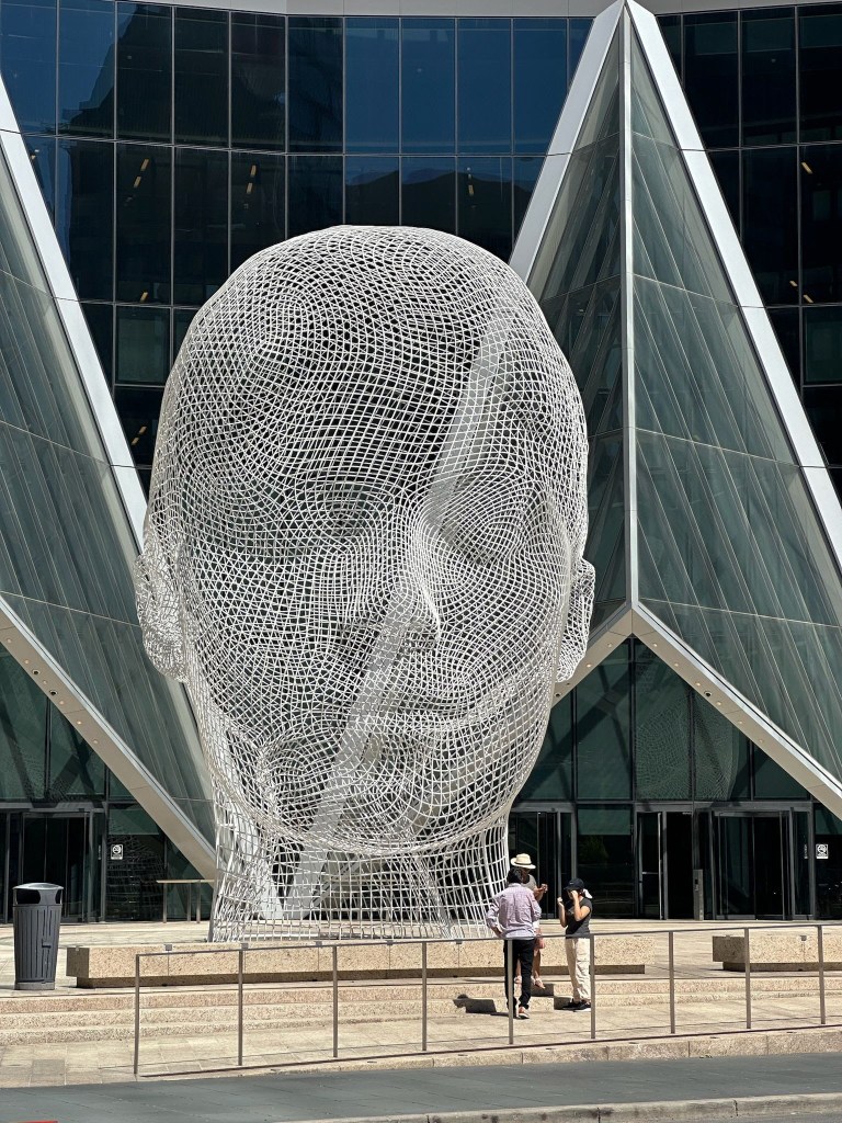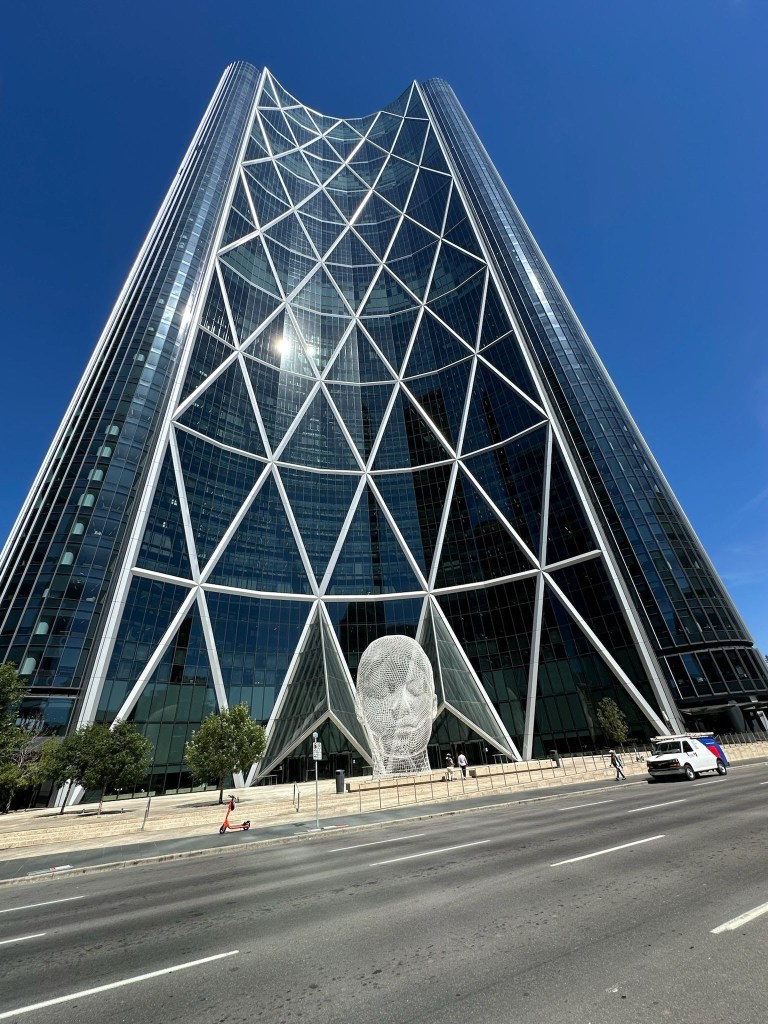 Avui toca descoberta del Down Town de Calgary. No soc molt entusiasta dels paisatges urbans, però el centre ciutat de Calgary m’encanta. Potser perquè el veig cada dia des de quasi qualsevol punt de la ciutat, potser perquè ja el considero un lloc conegut, una imatge amb certa connexió amb “casa”. El cas és que m’agrada passejar i ensenyar el centre. Avui fa calor però jo m’emporto un jersei per si de cas, que sempre acaba canviant el temps. En el que portem d’estiu, però, no han pujat tan les temperatures com avui. Després d’insistir fins a l’extenuació que al Canadà fa fred i que el fet de ser al mes d’agost no significa calor de màniga curta i sandàlies, arribats al migdia m’haig de menjar les paraules. Fot una calor de mil dimonis! En David em té fregida amb els comentaris sarcàstics sobre baixes temperatures i “rebequeta per a quan es giri fresca”. En fi …