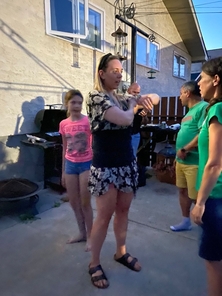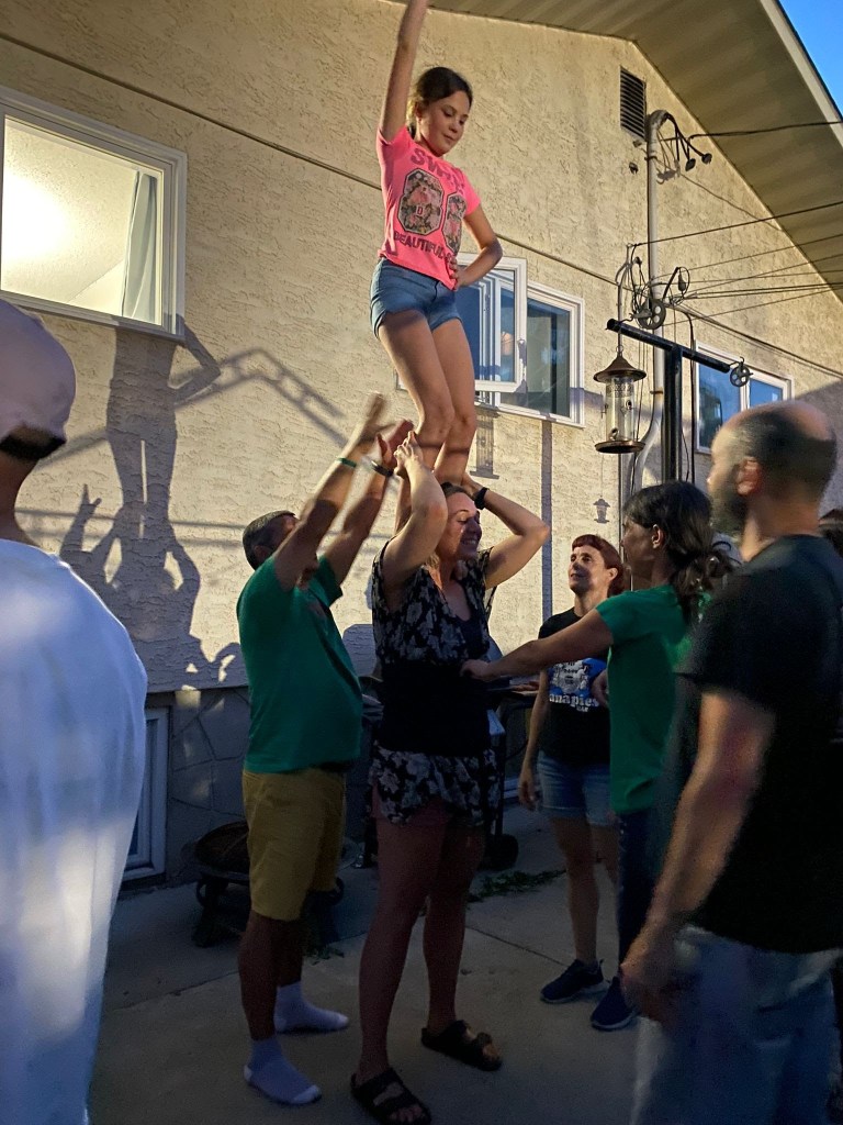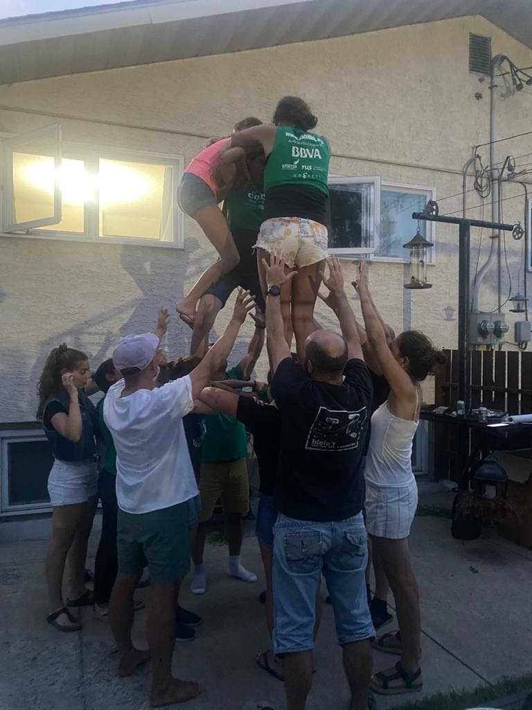 Cap a mitja tarda donem per tancada la teràpia de grup i fem equips de treball: uns van a buscar la carn per la barbacoa de la nit, els altres s’encarreguen de la canalla i la resta ens passegem fins a casa. Al vespre fem la típica barbacoa, la que s’acaba embolicant. S’hi afegeixen la Sarah (veïna) i l’Ivan, que ja és un més de la família. Més tard passen també a saludar uns altres veïns del carrer. El fet que no els coneguem d’abans no és cap inconvenient. Un cop presentats, els convidem a una birra i ja són “coneguts”. Com no pot ser d’altra manera, la vetllada acaba amb una conversa llarga i profunda sobre castells i amb una sessió pràctica on l’Ivan i la Sarah comencen la seva immersió en el món dels castells.