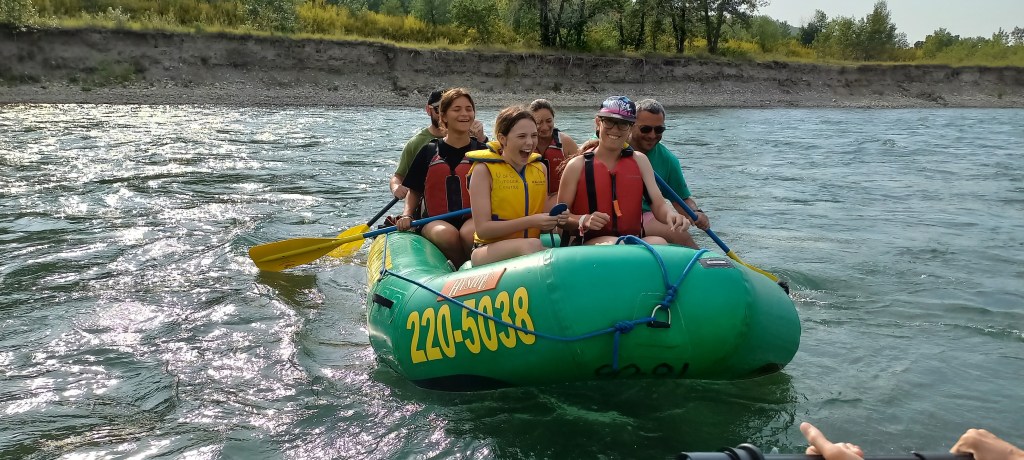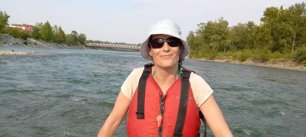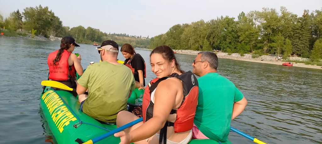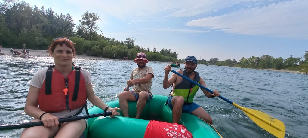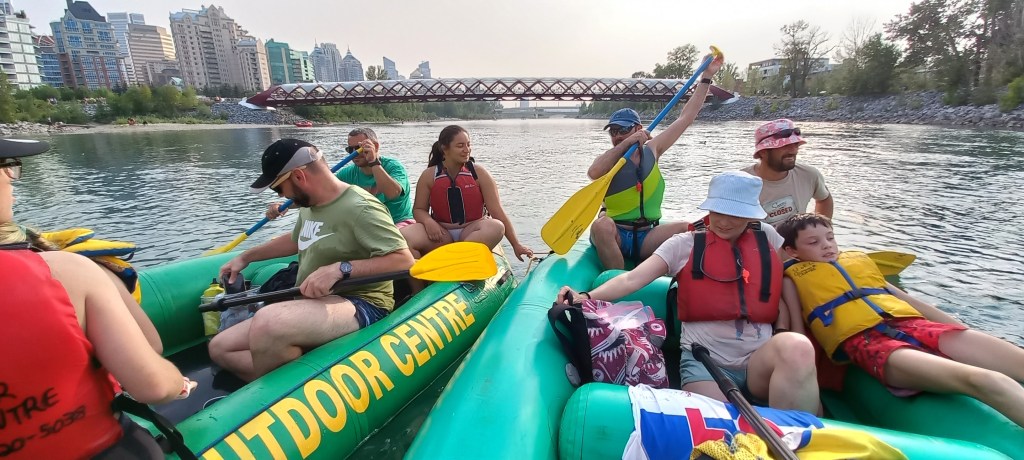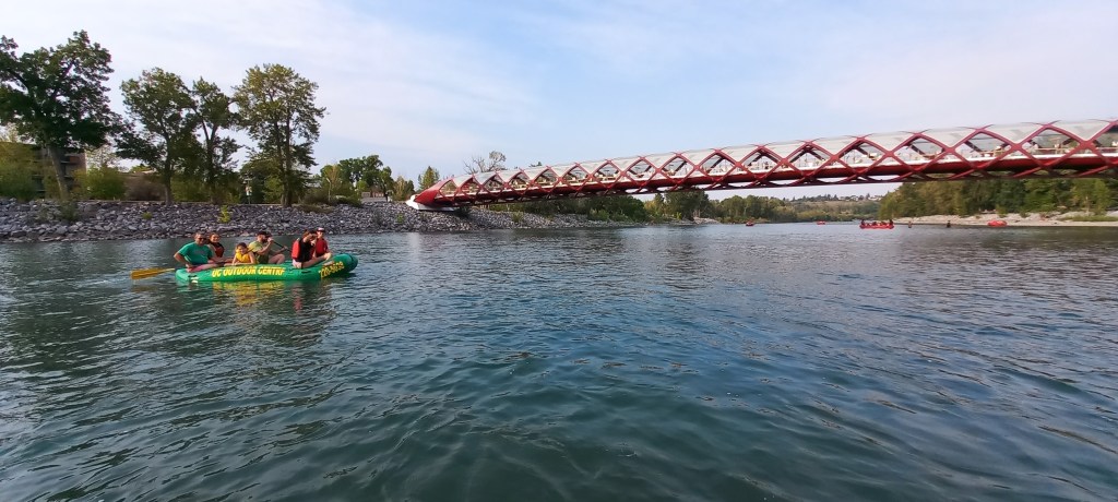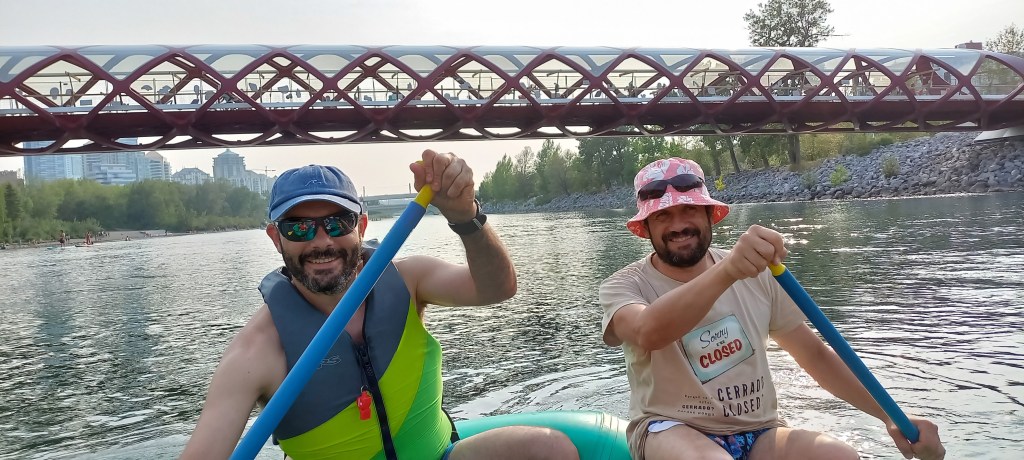 Continua la calor intensa i poc habitual a la ciutat de Calgary. En Manzano i en Joan Carles continuen fent comentaris sarcàstics sobre el tema. Òbviament no es creuen que a Calgary l’estiu no és com a Catalunya. D’ençà que han posat els peus a la ciutat, fa calor com a l’agost a Sabadell. Avui aprofitem per a fer una de les activitats estrella de l’estiu a la gran metròpoli d’Alberta: baixar el riu Bow en barca. La idea és començar a l’extrem oest de la ciutat i deixar-nos portar pel corrent fins als ràpids on vàrem estar ahir. El recorregut és ben fàcil i plàcid. M’agrada molt quan passem pel Down Town i sota el Peace bridge (el pont vermell de Calatrava). La jornada no acaba de ser el que havia imaginat. Empeses per un inesperat instint de competició, les dues barques que hem llogat es llancen riu avall una velocitat de vertigen. Els tripulants de cada embarcació remen amb intensitat intentant “guanyar” ves a saber què, sense ser conscients que el trajecte és llarg. L’Anna “cau” incomptables vegades a l’aigua. En Manzano, en canvi, no “cau” ni una sola vegada. La seva samarreta, però, queda molt afectada després de salvar diverses temptatives per part d’un membre de la seva tripulació per a fer-lo caure.