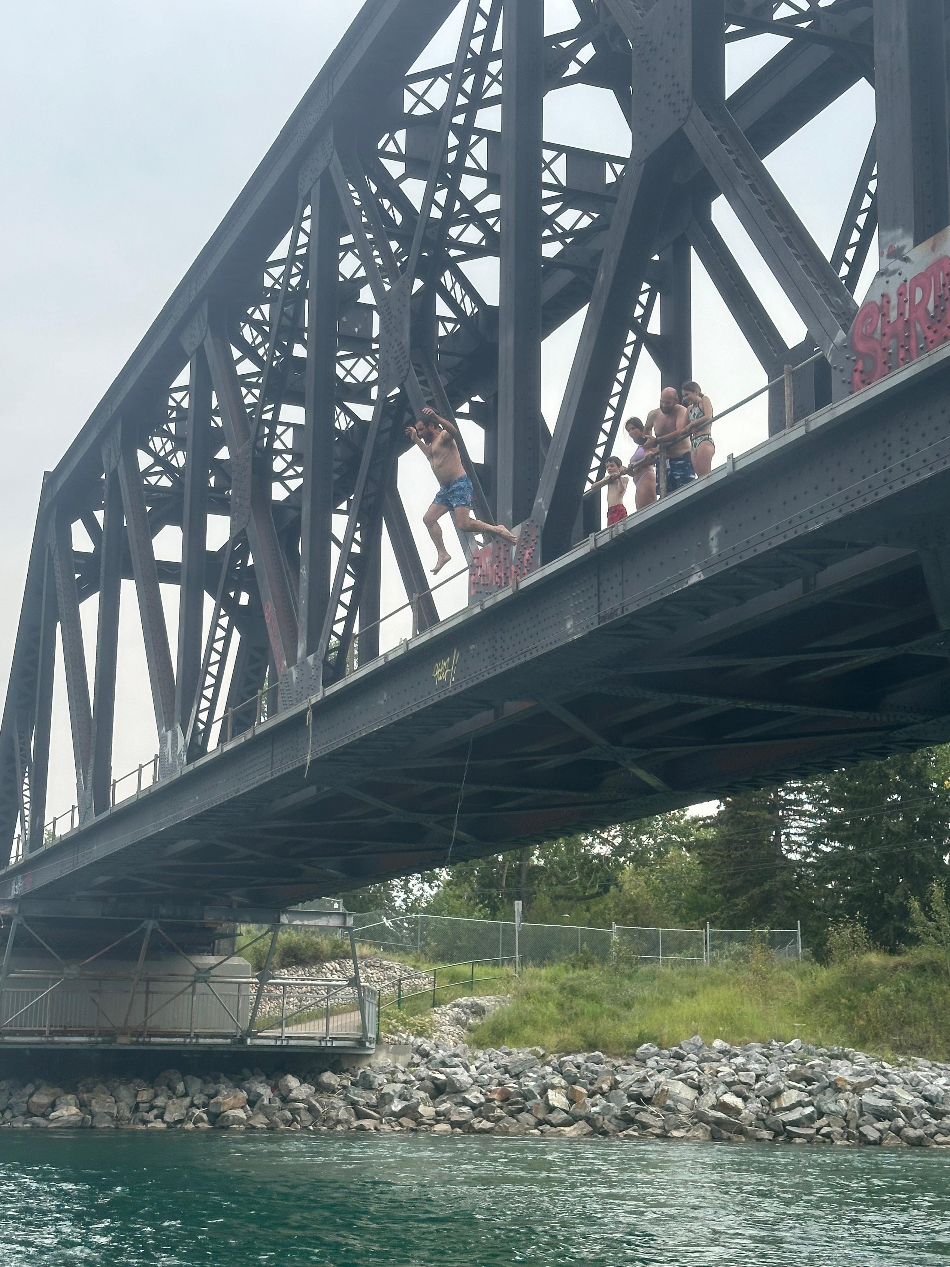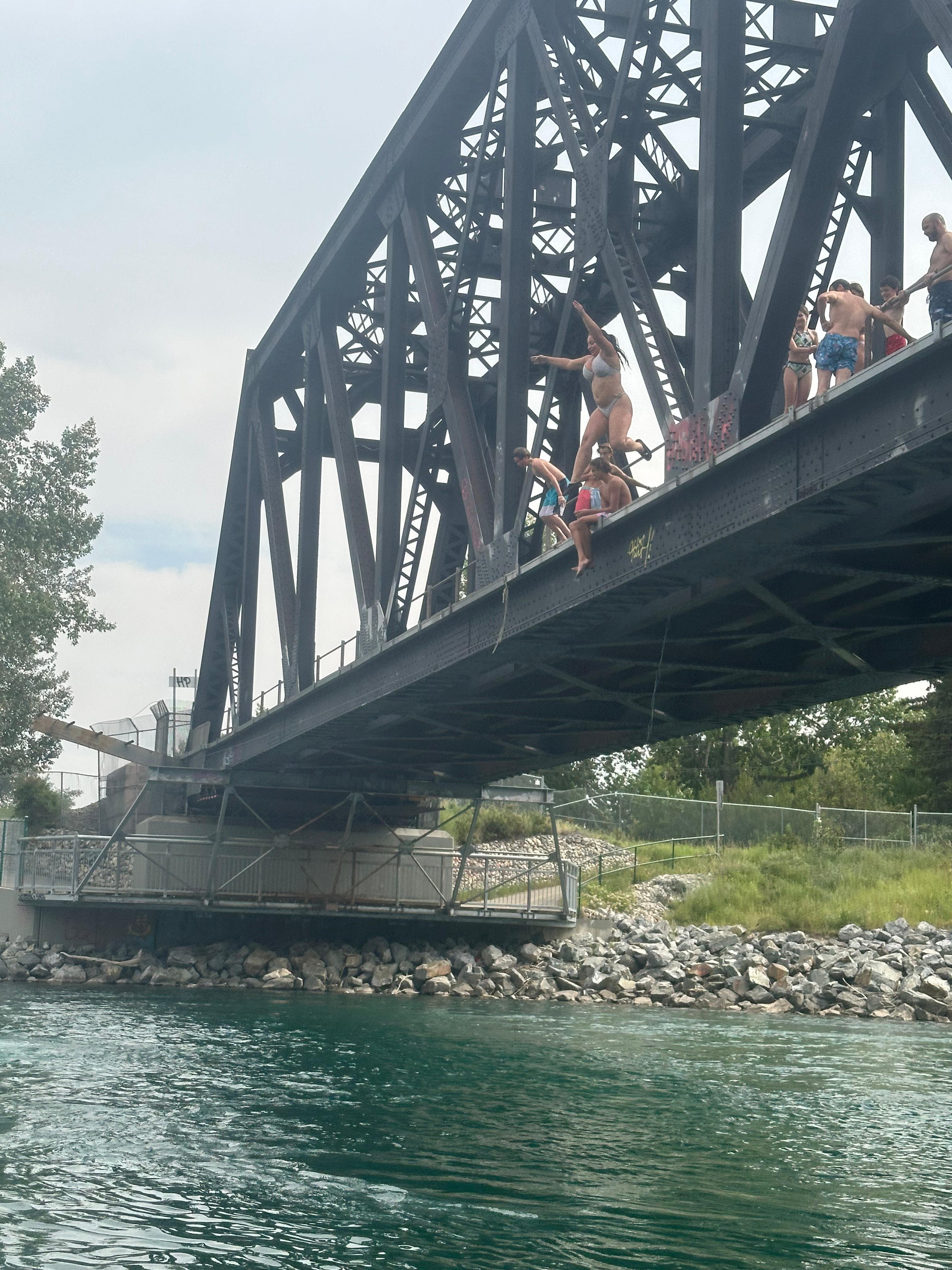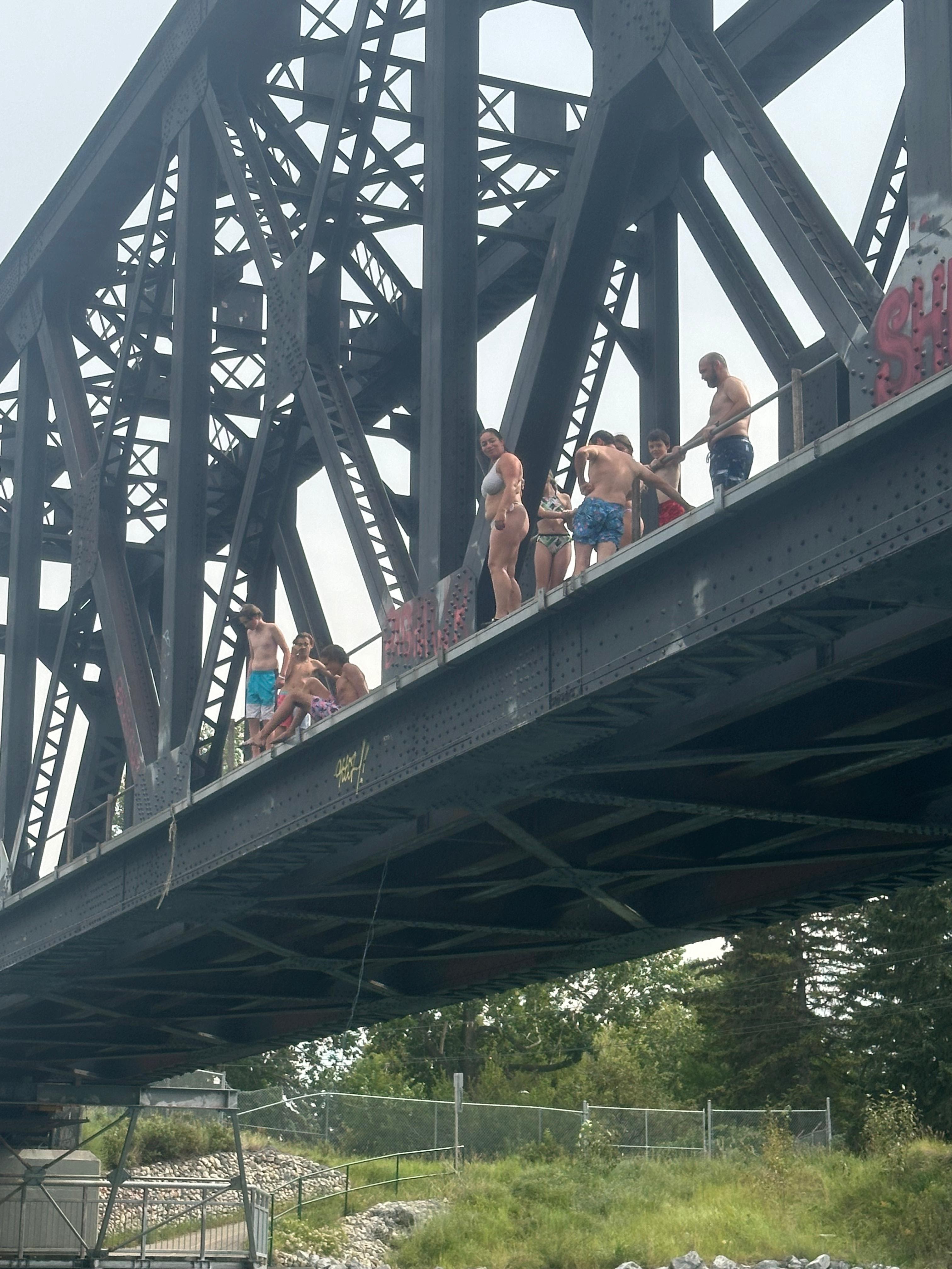 En un dels meandres del riu trobem certa aglomeració de persones i embarcacions. La gent anima a alguns valents que han pujat a un dels ponts que travessa el riu. És un pont per a la via del tren fet de bigues de ferro. Alguns salten des del pont al riu. És una alçada considerable. Nosaltres també parem. Alguns components de la nostra expedició volen provar-ho. La majoria salta, no sense abans pensar-s’ho una bona estona.