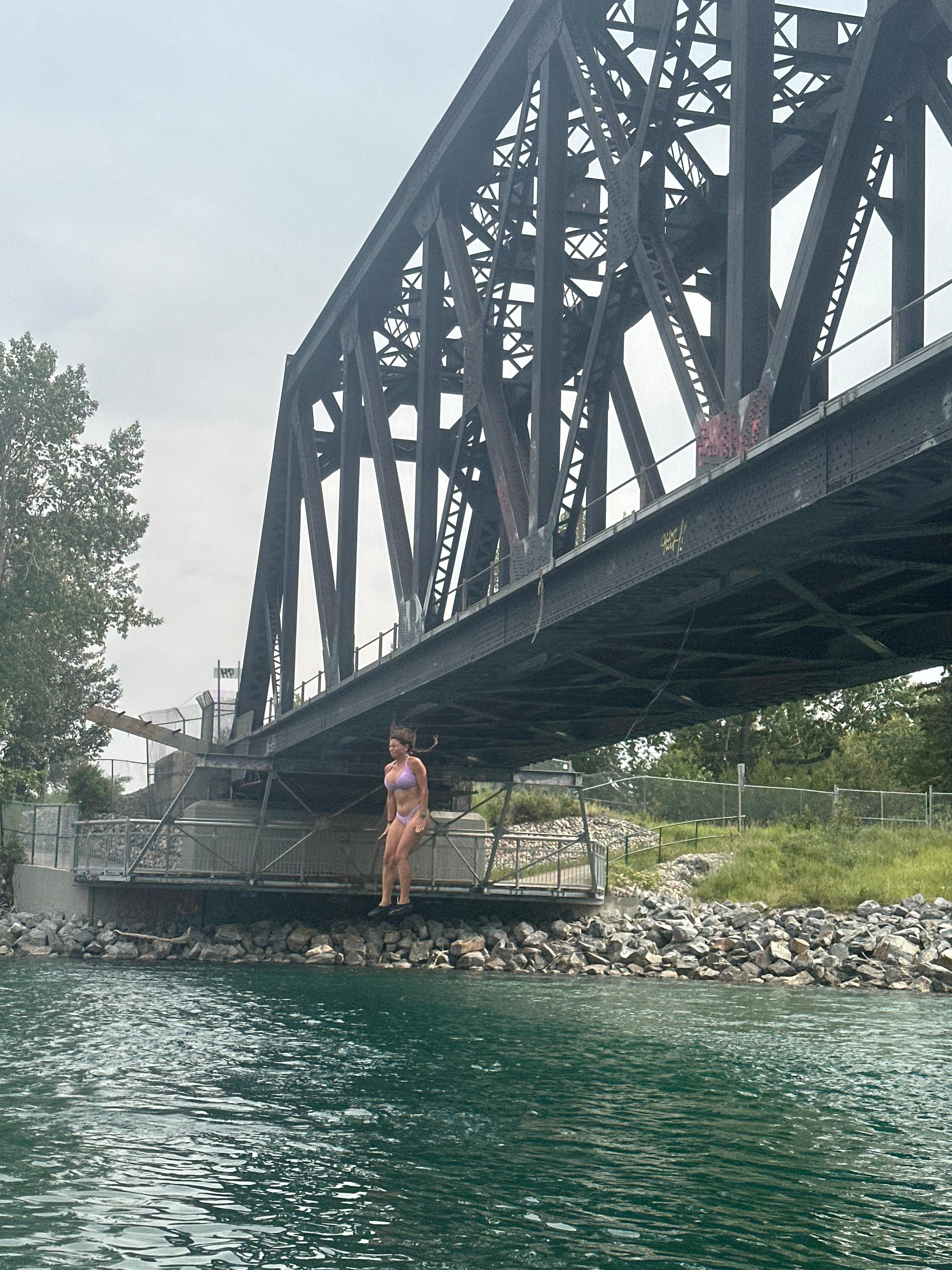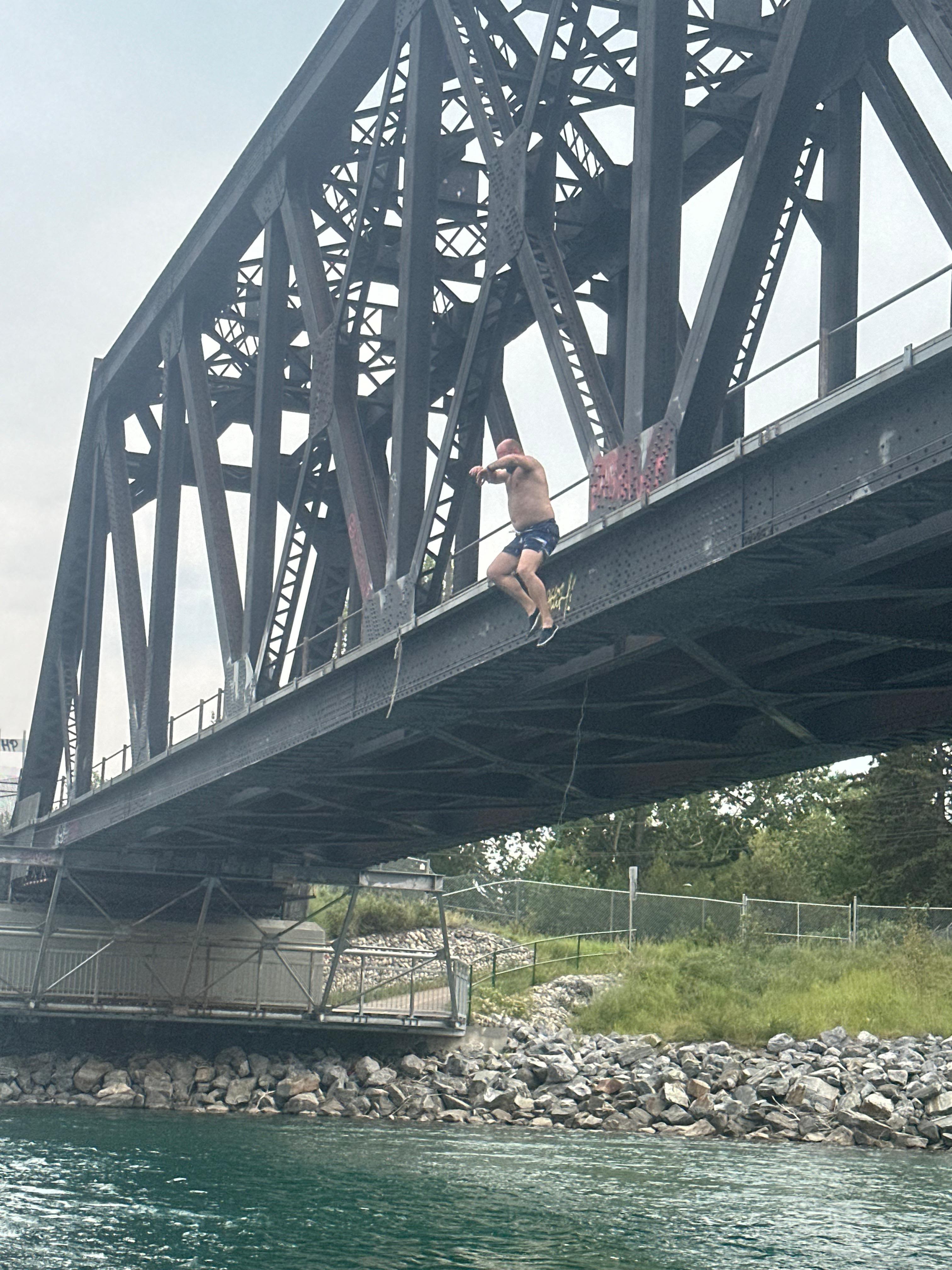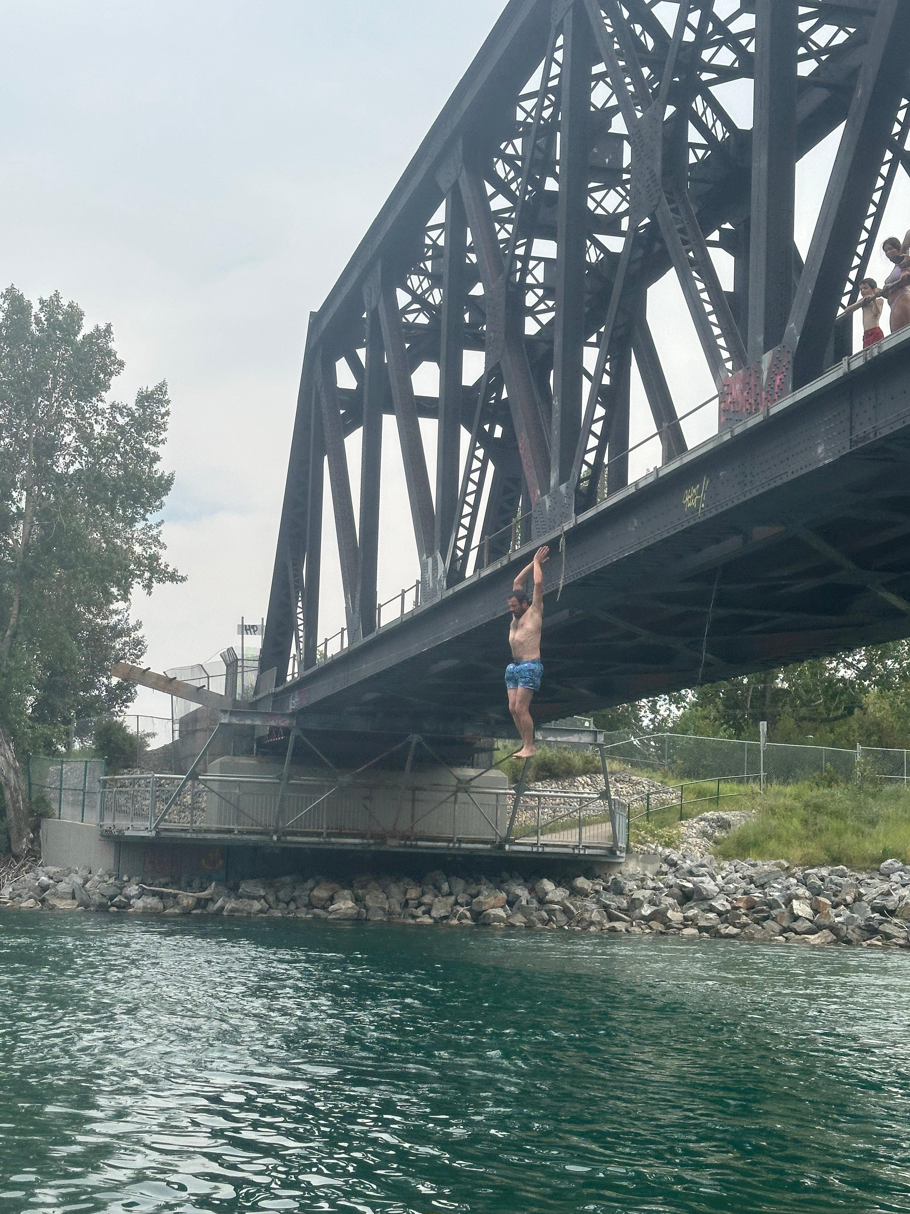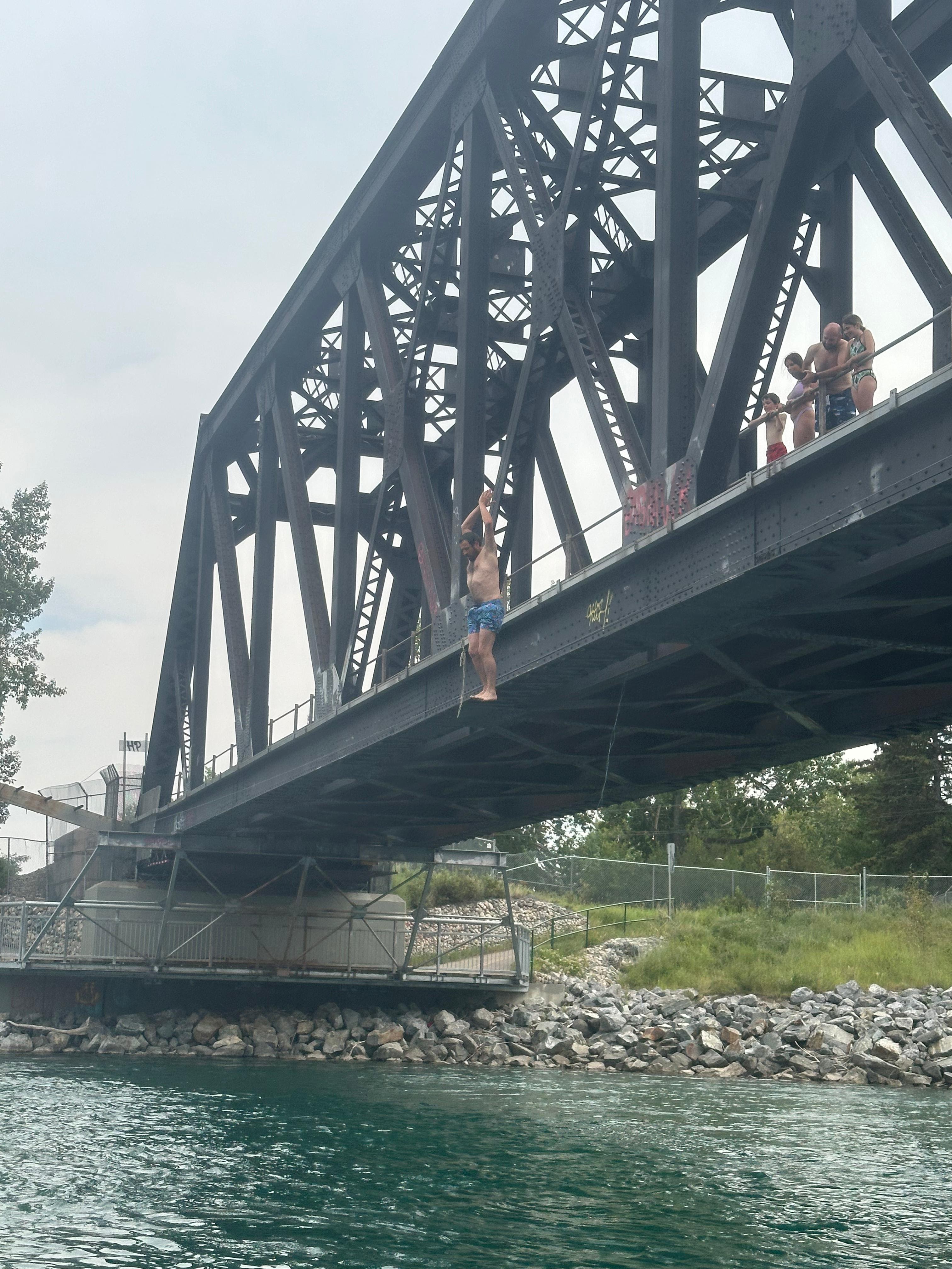 En un dels meandres del riu trobem certa aglomeració de persones i embarcacions. La gent anima a alguns valents que han pujat a un dels ponts que travessa el riu. És un pont per a la via del tren fet de bigues de ferro. Alguns salten des del pont al riu. És una alçada considerable. Nosaltres també parem. Alguns components de la nostra expedició volen provar-ho. La majoria salta, no sense abans pensar-s’ho una bona estona.