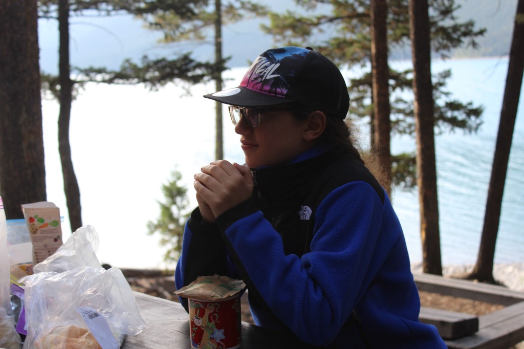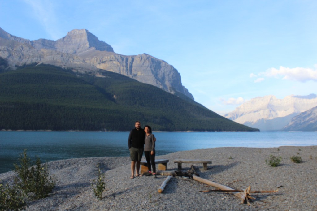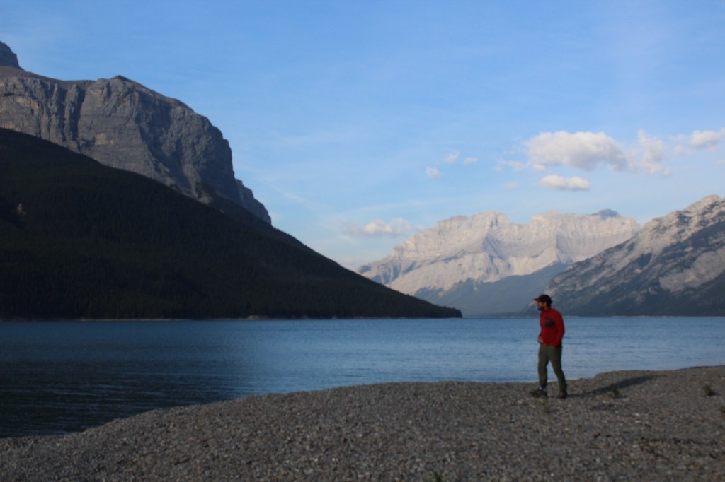 Veient la comitiva i tenint en compte que fa temps que no acampem en versió “silvestre”, en Dani opta per una ruta fàcil i sense sorpreses: Minnewanka lake, a tocar de Banff. La sorpresa ens l’enduem quan arribem dissabte a mig matí al punt d’inici de la ruta, arran de llac. Està a petar de gent! A l’aparcament no hi cap una agulla i la gent camina en massa fins a la vora del llac. La majoria estirant el típic carret de pícnic amb la nevereta, la barbacoa portàtil i la teca. Em sembla veure alguna família desplegant unes estovalles. El nostre grup, carregats amb les motxilles, tendes i sacs de dormir desentona amb l’entorn. Sembla més l’aplec de la Salut que una ruta d’acampada a les Rockies. Miro en Dani de reüll, que aspirava a una excursió en petit comitè, més aviat mística. El veig resignat. Les primeres vistes del llac Minnewanka, però, són espectaculars. En Dani dibuixa un mig-somriure.