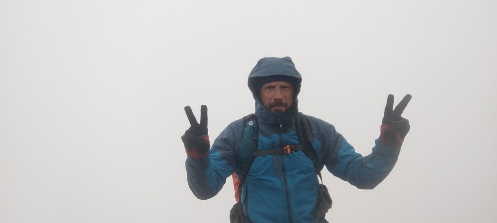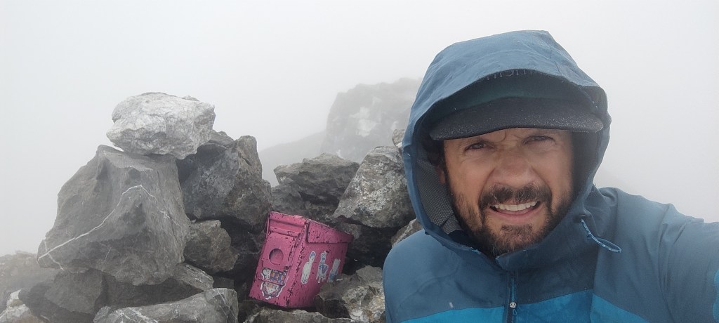 Hi va haver dos trams en els que vam estar a punt de fer marxa enrere, però finalment vaig arribar al cim! Estava eufòric! Va ser una pujada molt dura, però havia valgut la pena. Menjar una mica, foto, signatura al llibret i començar a baixar poc després que arribés l’altre Dani, que la neu començava a acumular-se al cim i una baixada amb tot el camí nevat ens hauria posat en molts problemes.