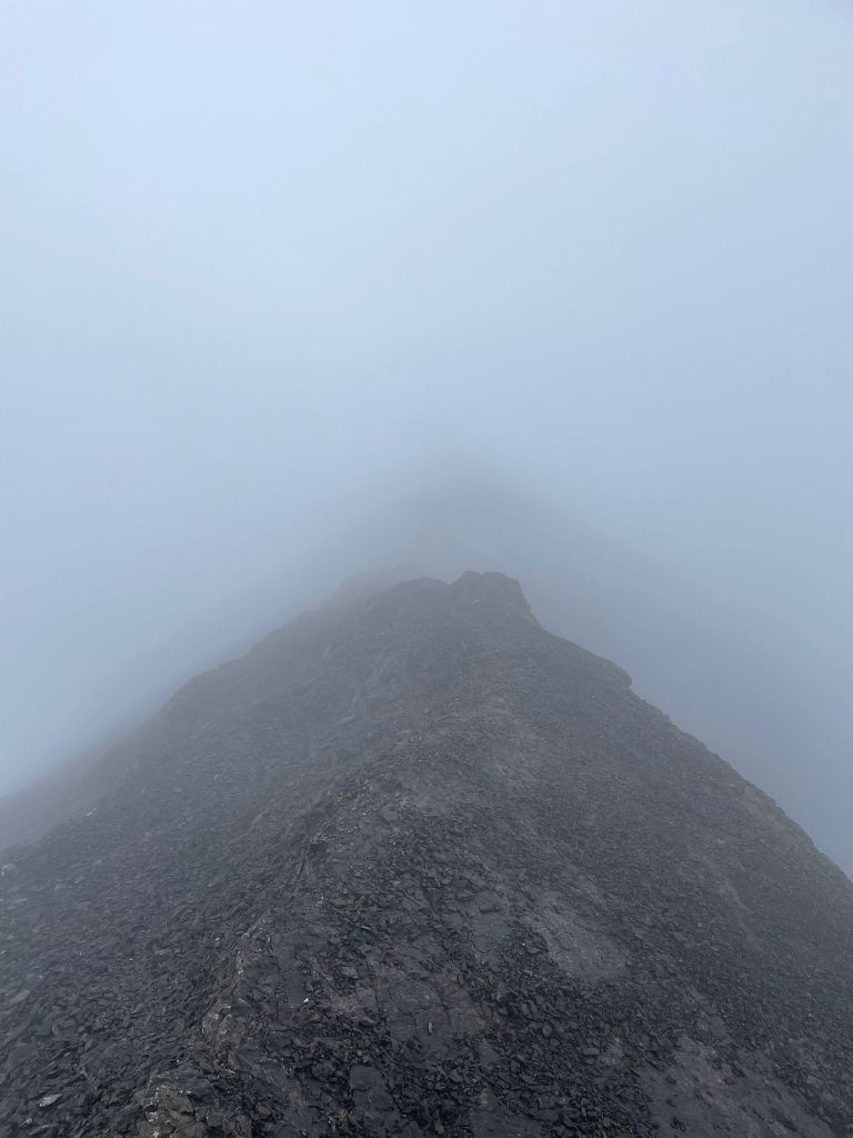 A poc a poc i a causa de la lesió que l’altre Dani patia en un dels turmells, ens vam anar separant. Vaig anar pujant sense pressa però sense parar per la cresta cada cop més empinada i exposada. Tenia les mans gelades i els guants d’estiu no feien gaire efecte. No hi ha gaire muntanya per veure, però la carena només deixa dues opcions, la part dreta, llisa i amb una caiguda que es perd entre la boira i la part esquerra, amb pedra descomposta, glacial al fons i zones de neu d’aquest any en la que intento no relliscar.