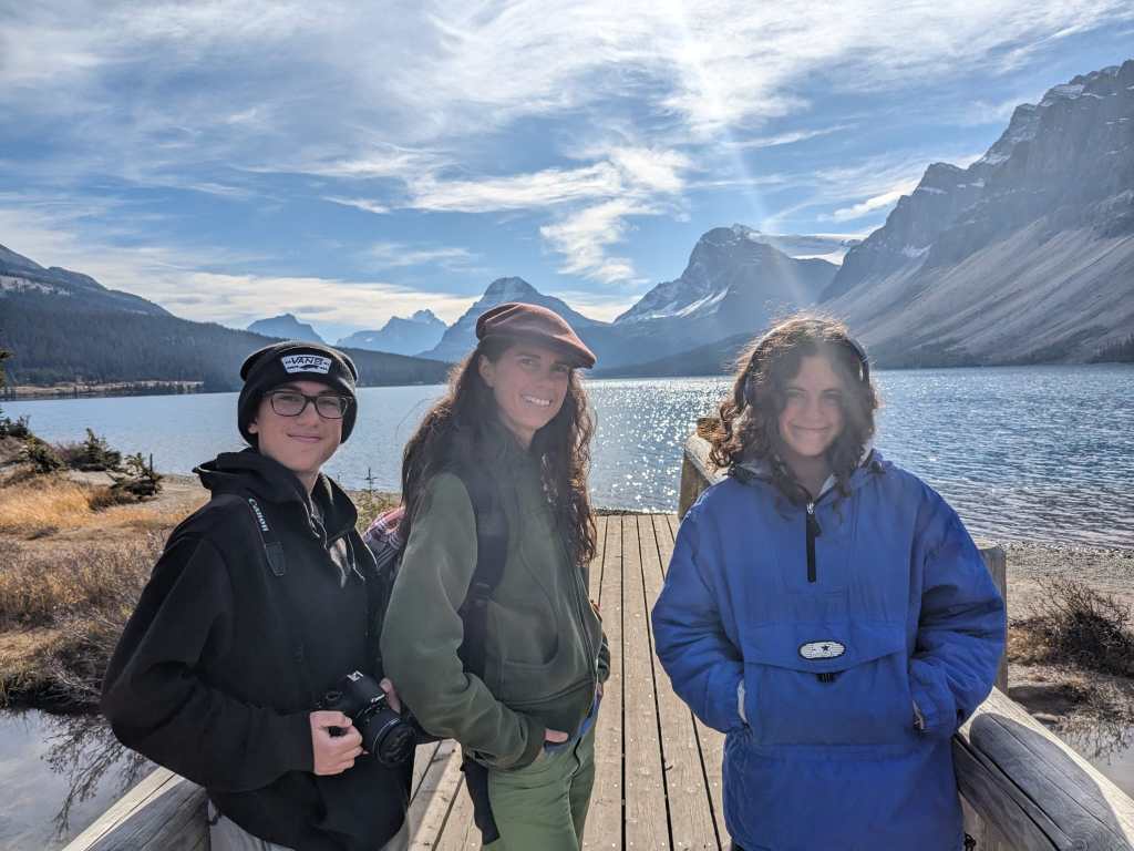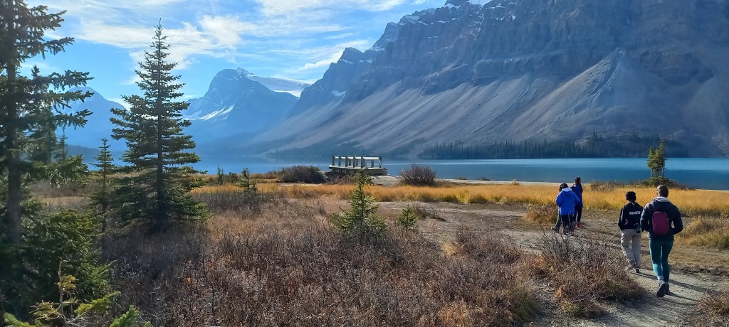 A la segona excursió descobrim un llac que, a parer meu, res té a envejar al Lake Louise o Moraine Lake. Bow Lake és un llac enorme en un pla entre muntanyes. Fem part del circuit que voreja el llac fins a les muntanyes que hi ha a l’altre cantó. L’aigua del llac està absolutament plana, sembla un mirall on s’hi reflexa el perfil de les muntanyes que envolten el llac. Deixem el llac enrerre i el camí s’enfila muntanya amunt fins que perdem de vista la gran massa d’aigua. Les muntanyes comencen a estar enfarinades de neu sols a les parts més altes. El camí acaba al Bow Glacier Falls, un antic circ glaciar, envoltat de parets verticals enormes de roca pelada. A la paret oposada cau una gran cascada deixem a l’adolescent descansant al mig del circ i la resta grimpem la paret vorejant el salts d’aigua. És impossible arribar a dalt de tot però a mitja alçada les vistes són impresionants. Desfem el camí entre les muntanyes fins que albirem el llac. Just el sol comença a amagar-se entre les muntanyes i tenyeix el cel i el llac de tota la gama de roses i tronges. Realment no té res a envejar a Lake Louise.