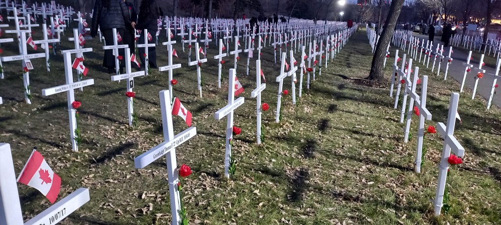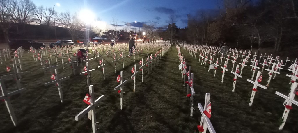 Al vespre en Dani, l’Ona i jo visitem un espai de la ciutat dedicat a tots els canadencs caiguts en les diferents guerres des de la Primera Guerra Mundial fins a l’Afganistan. El lloc m’impressiona. Una creu blanca per a cada 1.000 soldats morts. 120 creus. 120.000 soldats caiguts en batalla tots ells fora del Canadà. Un munt de soldats per ser que el Canadà té fama de país pacifista. Passegem una estona entre les creus i assistim en aquest espai a un acte de natius nord-americans que reconeixen els soldats natius caiguts en batalla. Sí, d’aquests també n’hi va haver a la Segona Guerra Mundial. Alguns d’ells es van enrolar a l’exèrcit canadenc amb la promesa de ser reconeguts com a ciutadans canadencs de ple dret en tornar de la guerra. Però, com sempre, el govern canadenc té mala memòria per les promeses i acords amb els natius … Potser és per això que necessiten un dia oficial per a recordar?