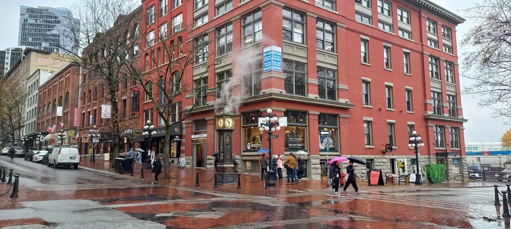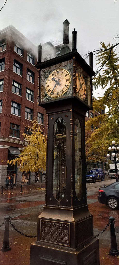 Amb la panxa plena comencem la nostra ruta particular pel Down Town. De seguida ens adonem que Vancouver “respira” diferent que Calgary. Gent passejant per les voreres, botigues, restaurants i cafeteries pels carrers, cel gris i un plugim constant. Topem amb un curiós rellotge instal·lat en una petita torre al bell mig de la vorera. La Sira el reconeix a l’instant gràcies als vídeos de TikTok (sospir i caiguda d’ulls). És un rellotge ben especial: funciona amb vapor, cada quart d’hora fa una musiqueta i a l’hora en punt emet una melodia que se sent des de cada racó del Down Town. Foto de rigor i ens esperem que soni el primer quart.