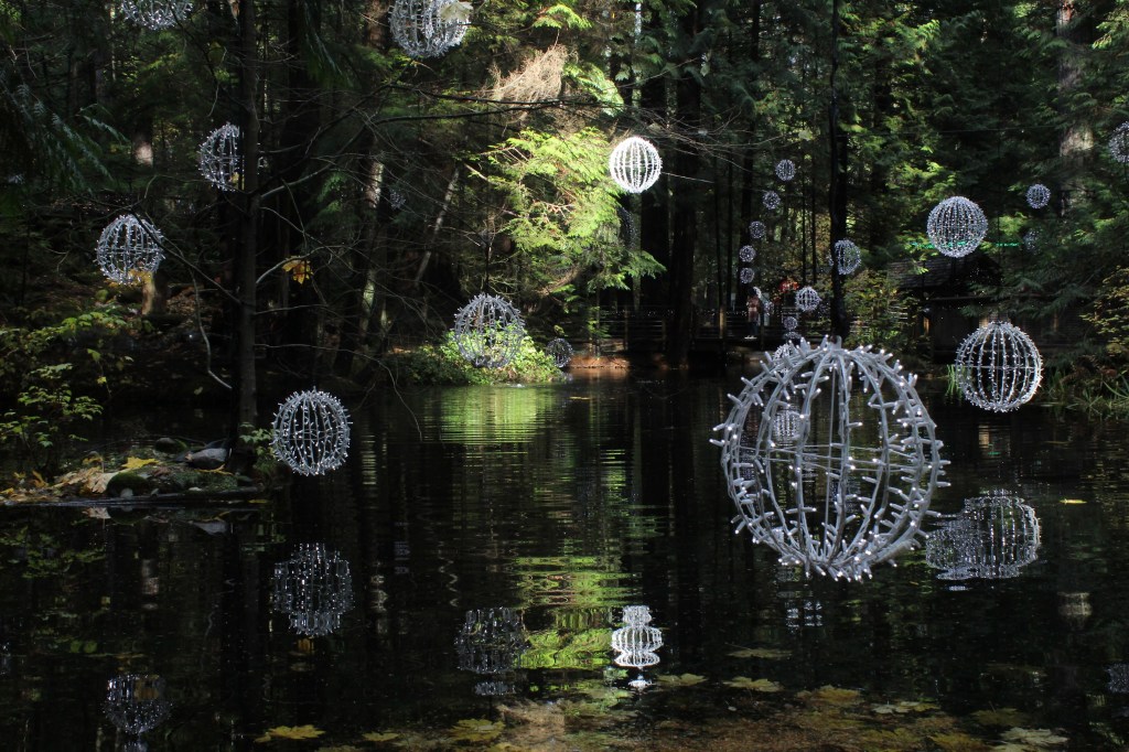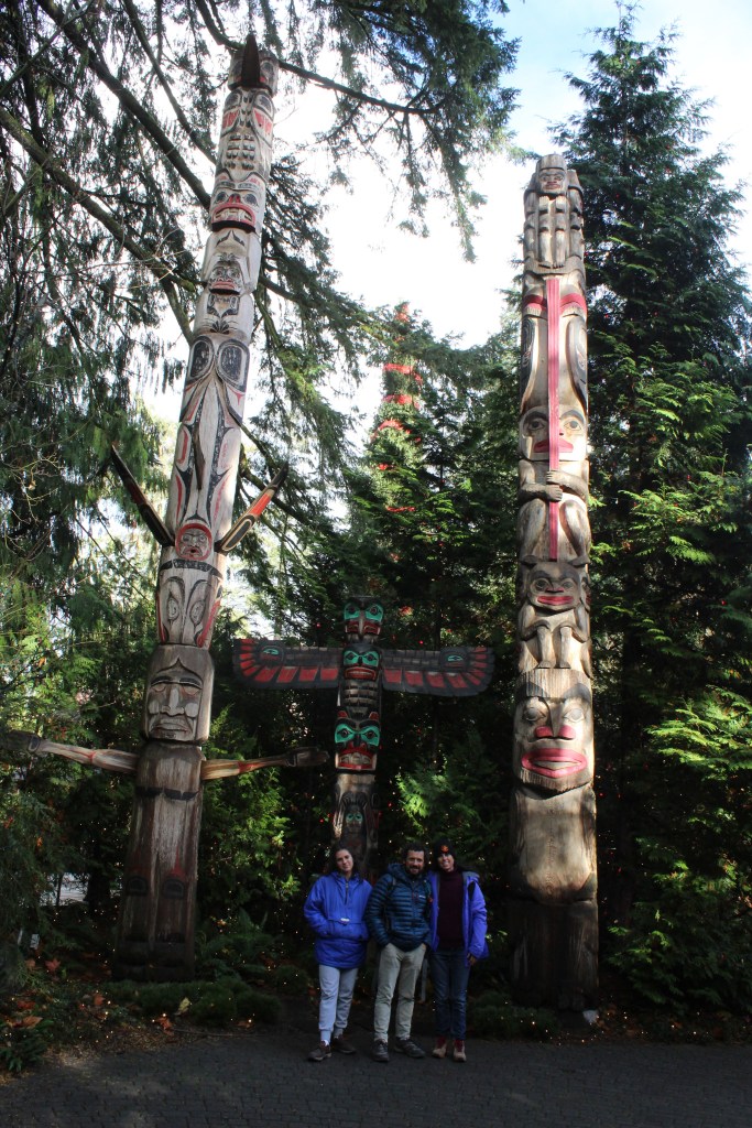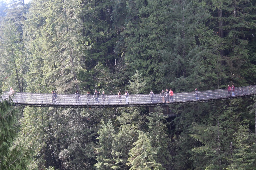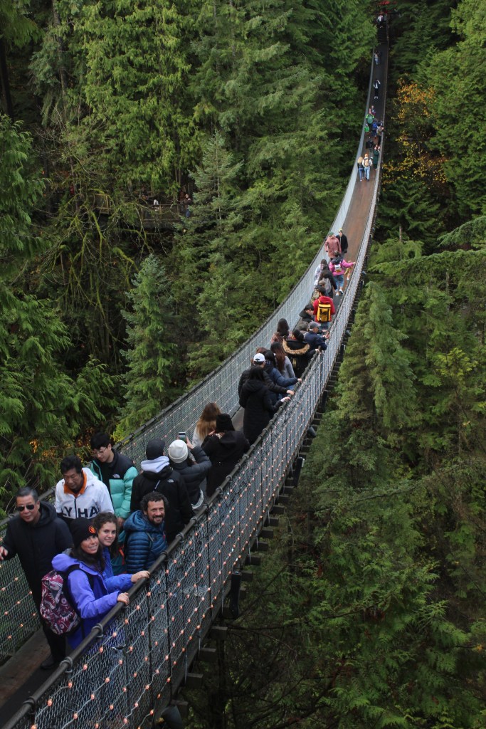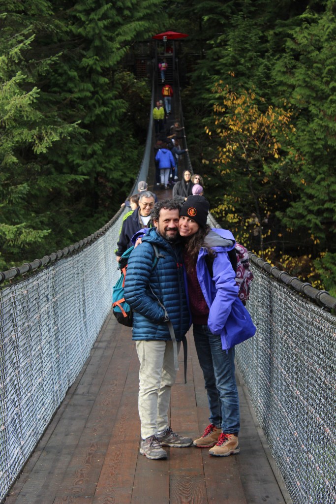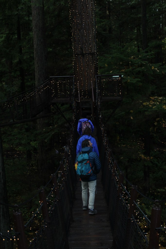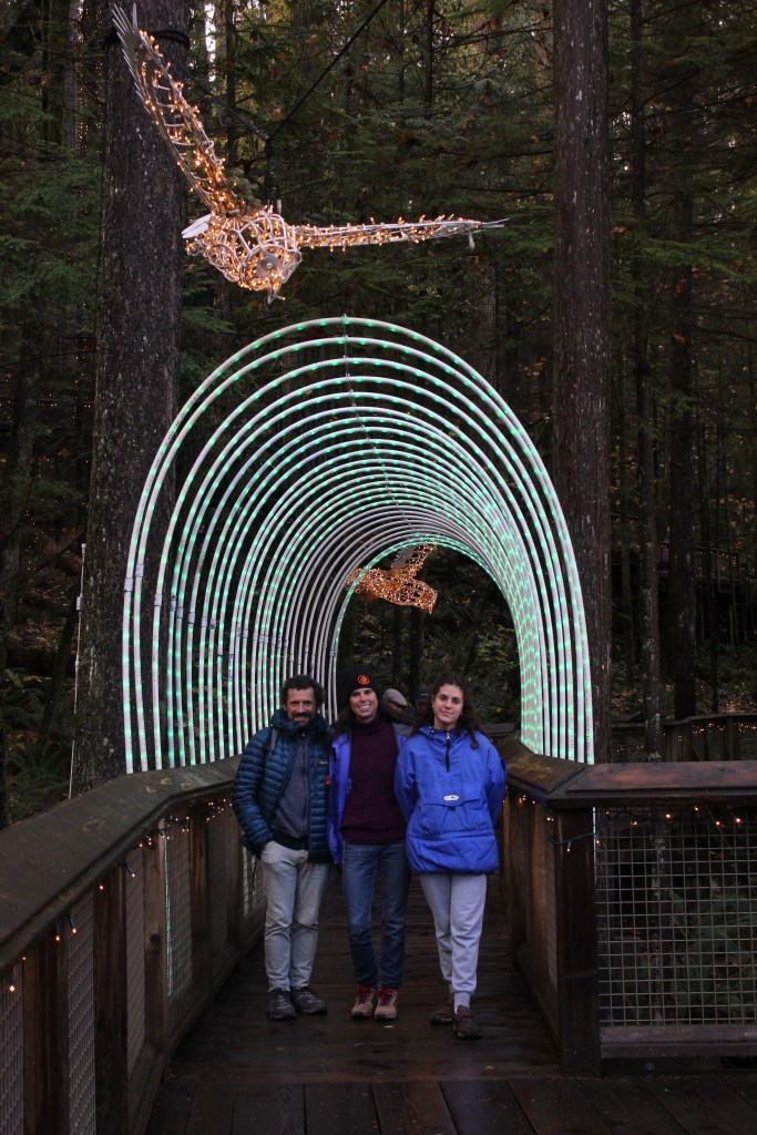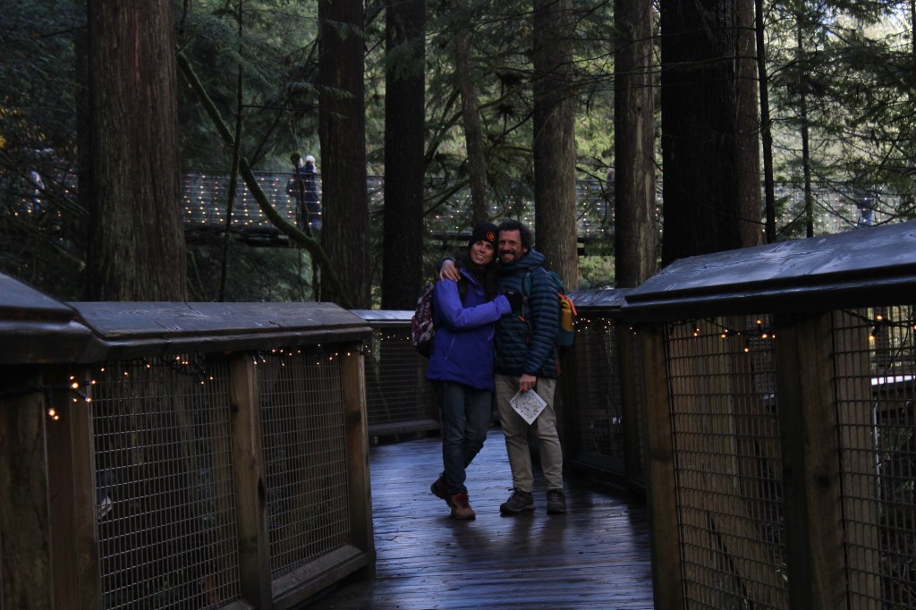 Un cop al cotxe, ens encarem amb l’activitat principal del dia, el Capilano suspension bridge. Aquest és un pont penjat d’un cantó a l’altre del riu, d’aquells que surten a les pel·lícules, és que ‘es como en las movies’. Va ser construït el 1888 per un escocès ric que havia decidit anar a viure a Vancouver amb la seva família. El lloc està a petar, hi ha gent per tot arreu, però això no farà que no ens ho passem bé. A un cantó del pont ens expliquen una mica la història del Capilano bridge, i una noia colombiana ens parla sobre els tòtems que els First Nations creaven en aquella zona. Ens decidim a passar el pont, i realment espero que això aguanti perquè hi ha moltíssima gent aquí. El pont es mou una mica de costat a costat, cosa que mareja, així que fem unes quantes fotos, mirem una mica el riu, que queda 70 metres sota nostre, i arribem a l’altre cantó. Allà hi ha unes passarel·les entre els arbres, com els hi agraden les altures a aquesta gent, i algunes activitats pels més petits, la Sira i jo les fem totes, òbviament. La veritat no sé com no ens perdem per aquests camins, això sembla un laberint. Ens passem unes dues hores passejant per allà i gaudint de les llums de Nadal que decoren tot el parc. Tres hores després d’entrar al parc, ens comencen a fer mal les cames així que decidim que és hora de marxar.