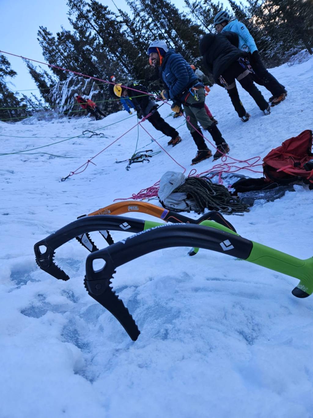 L’any passat vaig fer un curs d’un dia amb la universitat i prou. Aquest hivern hi volia tornar, però necessites tant material que resulta impossible, així que, aprofitant que alguns companys del grup del boulder són experts, hem muntat un dia d’experiència al gel per a principiants.