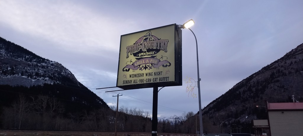 Abans de fer ja la tirada llarga fins a Calgary, decidim dinar al mateix poble de Frank. A part de l’episodi de l’esllavissada de fa 120 anys i la natura impressionant que l’envolta, Frank no té molt més interès. Potser és aquest el seu al·licient: el fet que sigui el típic poble del Far West sorgit de manera sobtada pel fet de tenir certs recursos interessants. Vista l’oferta gastronòmica escassa absolutament fora de temporada, optem per dinar al Pure Country, un típic restaurant del Far West. El local és enorme, però som pràcticament els únics clients. Un lloc ben curiós.