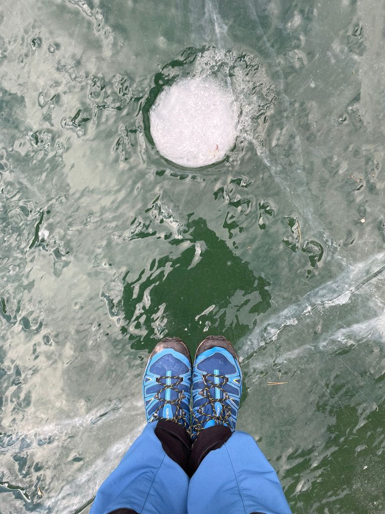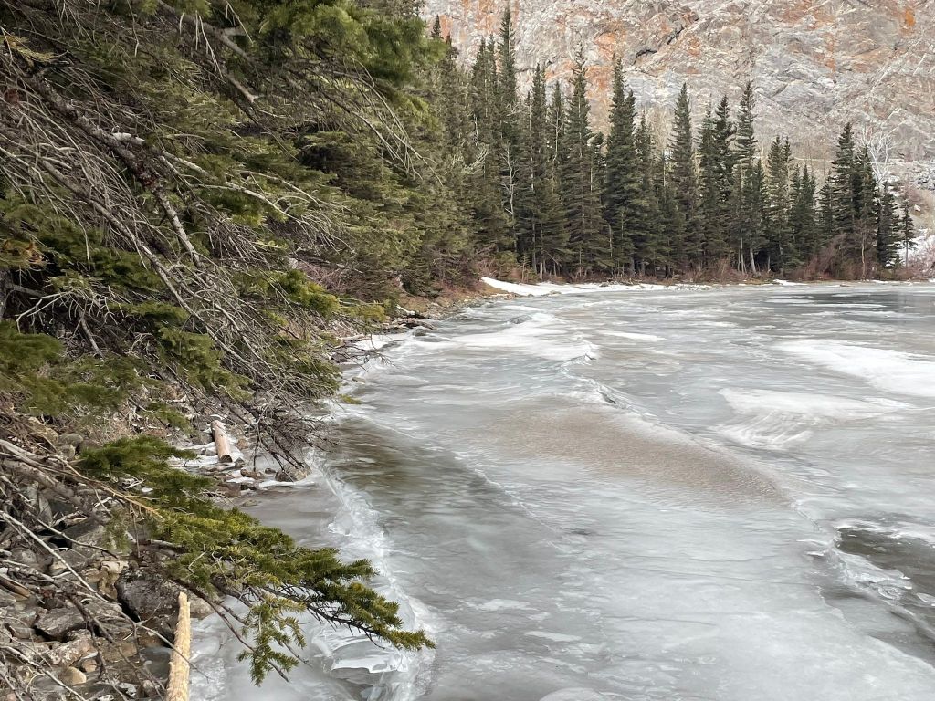 Parem a un llac arran de carretera, poc abans de deixar les Rockies. La idea és fer una circular caminant al voltant del llac. Arribats a cert punt el camí es complica i, aprofitant que està el llac està gelat, decidim creuar pel mig. La gruixuda capa de gel és tan transparent que podem veure l’aigua líquida de sota i les pedres del fons del llac. En alguna zona hi ha unes enormes esquerdes que ens recorden que el llac continua viu i en moviment, malgrat les aparences. Fa impressió caminar sobre el gel i ser conscient que sota hi ha certa profunditat d’aigua.