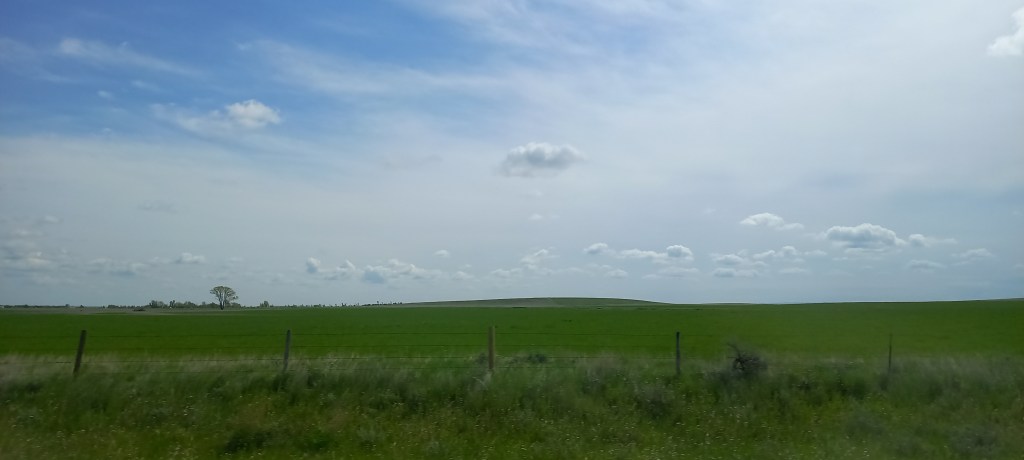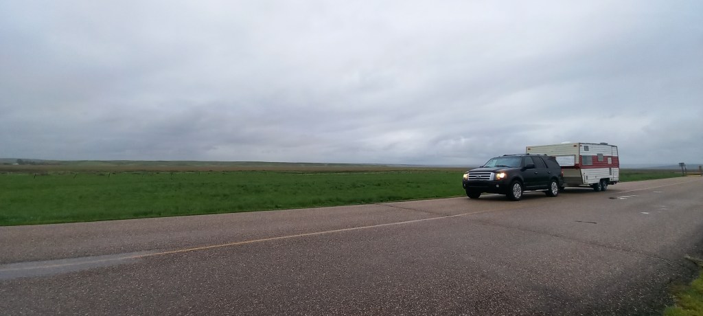 El trajecte fins a Saskatchewan no decep. Quilòmetres i quilòmetres de prats verds, plans com un camp de futbol. El verd intens de l’herba mullada contrasta amb el cel gris plom. Va plovisquejant tot el trajecte. Arribem divendres al vespre al càmping de Cypress Hills Provincial Park, al sud de Saskatchewan, fent frontera amb Alberta. Motiu de la tria? Proximitat amb Calgary i el fet que a la guia no hi trobem gran cosa més. Això promet! Ens instal·lem amb prou dignitat malgrat la pluja, el vent i la foscor. Per ser que no acostuma a ploure per aquestes contrades, avui s’hi ha posat amb ganes! Per a sopar mengem refugiats cadascú a la seva caravana i donem per acabada la jornada.