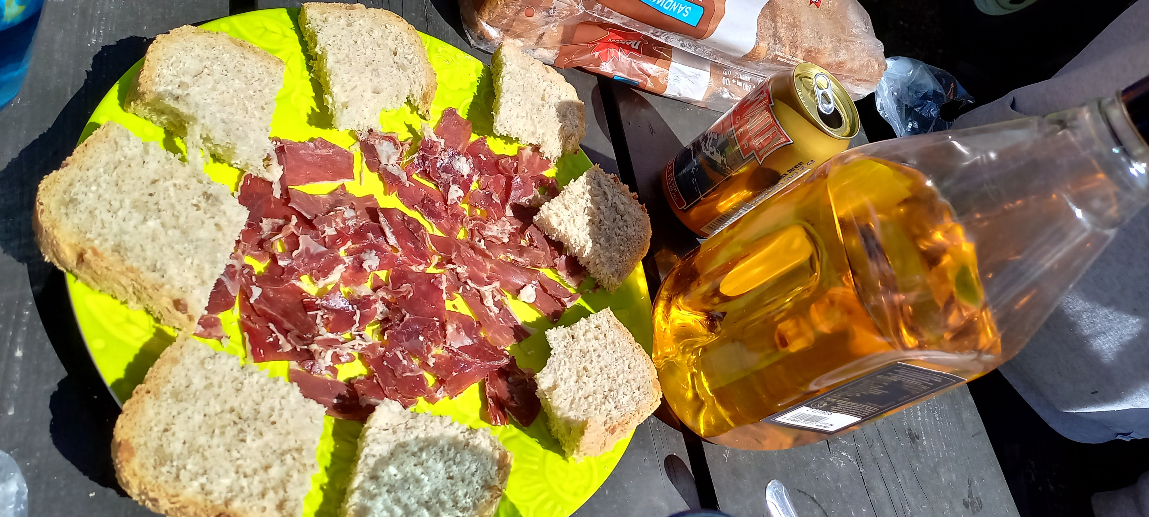 L’equip no-caminador ja ens espera al càmping, amb una sorpresa en forma de pernil Jabugo (que han comprat a preu d’or a una gran superfície de Calgary). L’exquisidesa l’acompanyem amb pa fet a casa, gentilesa d’en Daniel (un PPVV) i d’oli d’oliva de Huelva d’importació poc ortodoxa (millor no preguntar). Quin regal! La conversa gira, inevitablement, entorn del menjar, de plats de casa i tot allò que trobem a faltar. Ens instem abans de l’estiu a fer un àpat comunitari amb tots aquests plats que trobem a faltar. Prometo col·laborar-hi amb una safata de croquetes 🙂